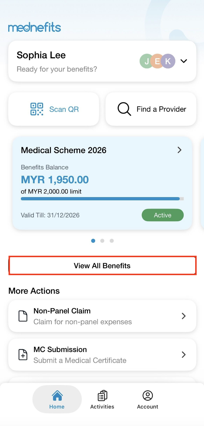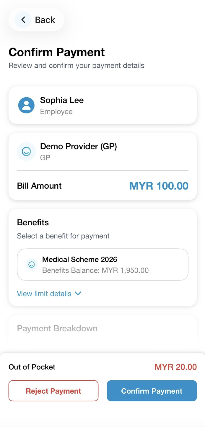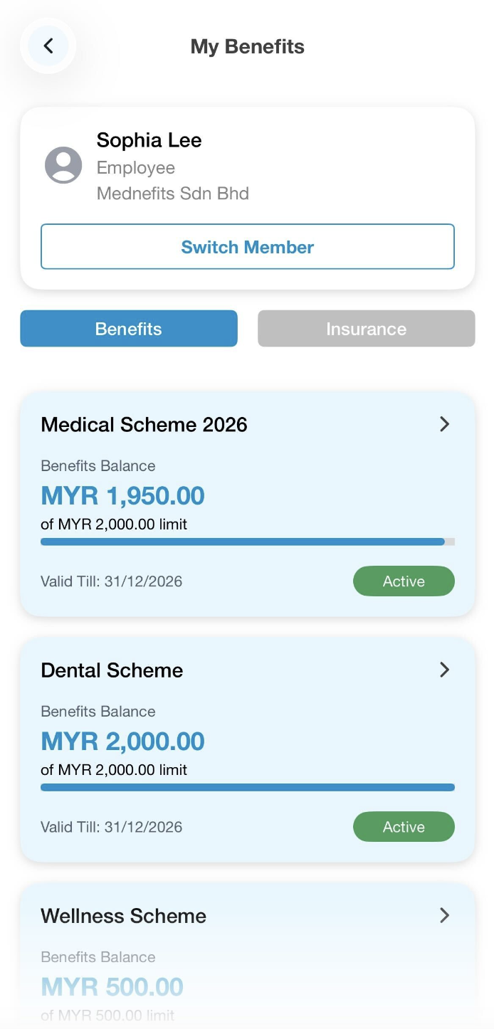 Your employer can set a Cap per Visit on your Mednefits account. You can view the details via your Mednefits app, simply go to View All Benefits and select any scheme under Benefits to see if you have a cap per visit.