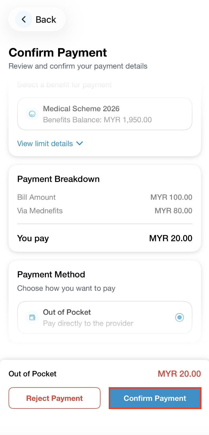 Step 7: After you are done reviewing your payment, click on Confirm Payment to complete the payment process. (Please ensure you enter the right total bill amount and for any Out of Pocket amount, please pay directly to the provider)