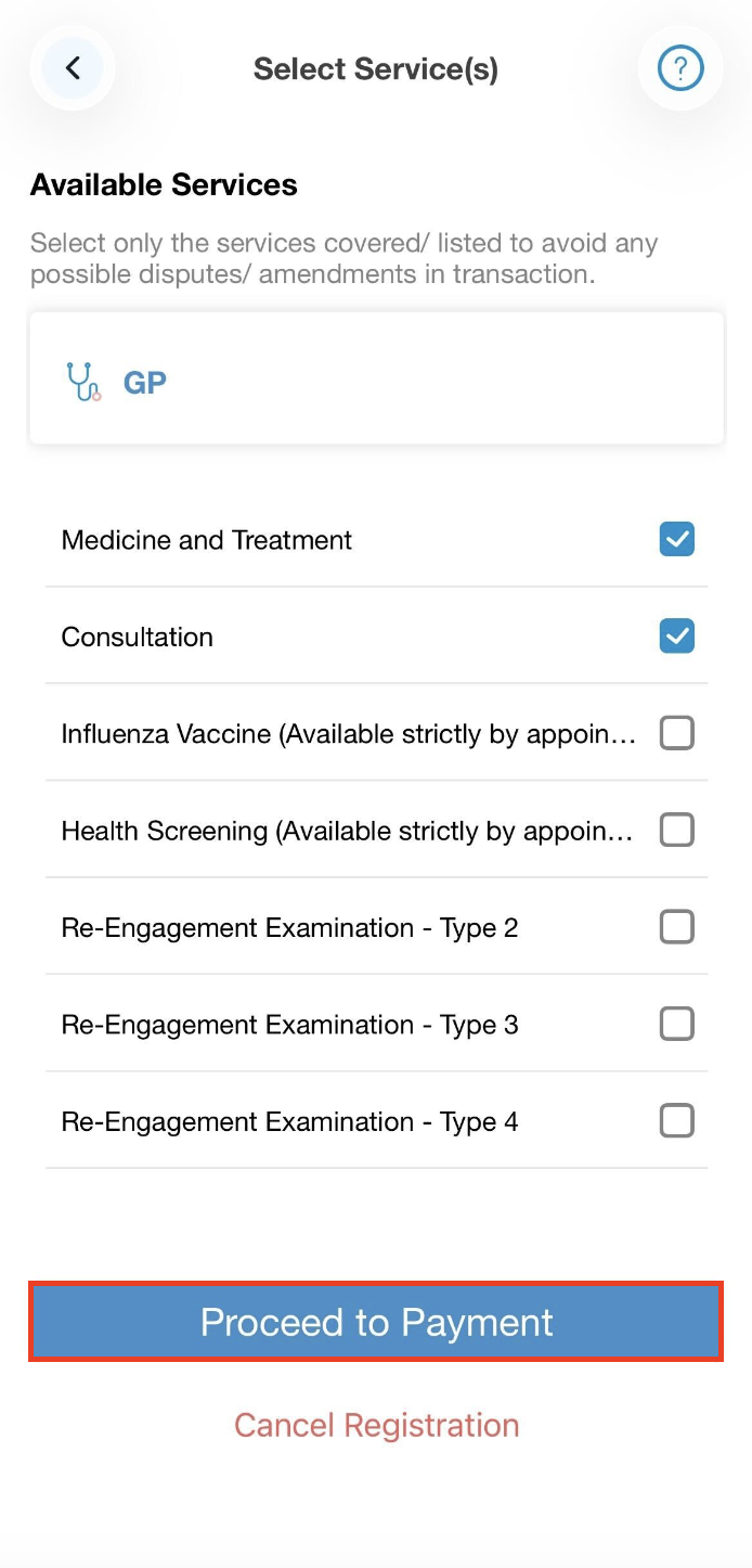 Step 4: The Checkout button will replace the Scan QR button to indicate that you have yet to checkout. When you are ready to checkout, tap the Checkout button, and on Select Service(s) page, select the services you have received before clicking on Proceed to Payment. (This page won't be displayed if the provider has only one service to offer)