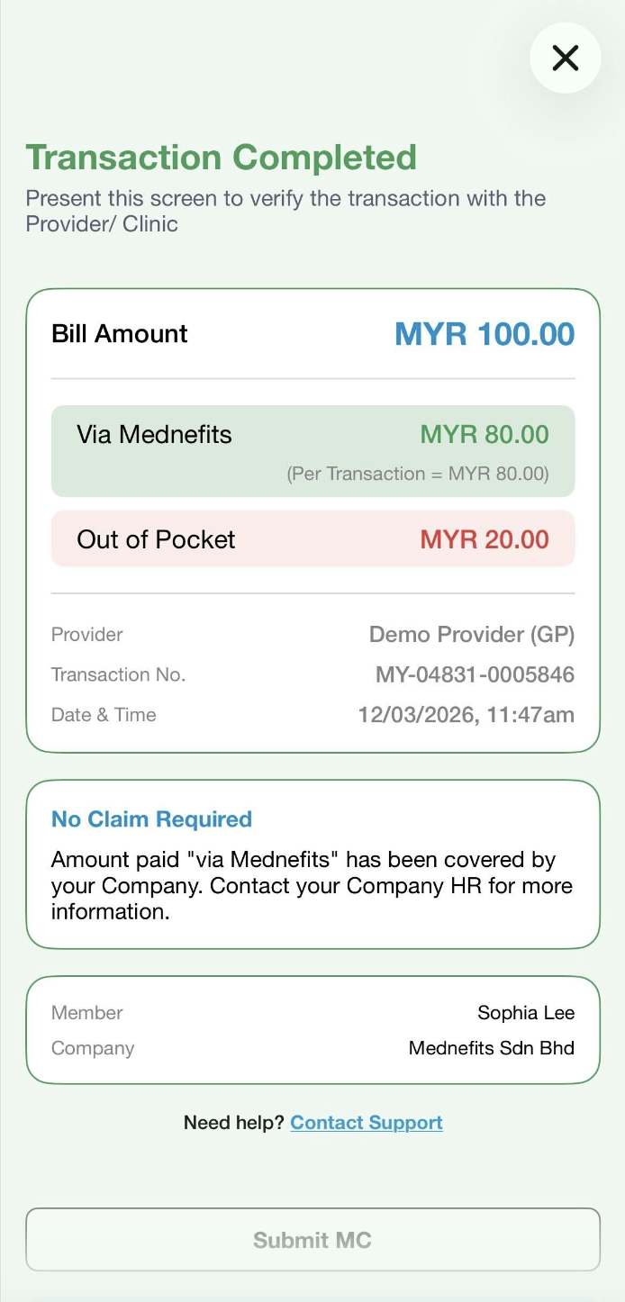 Step 8: On the Transaction Completed page, the figure under Via Mednefits is the amount that is deducted from your benefits for this transaction.