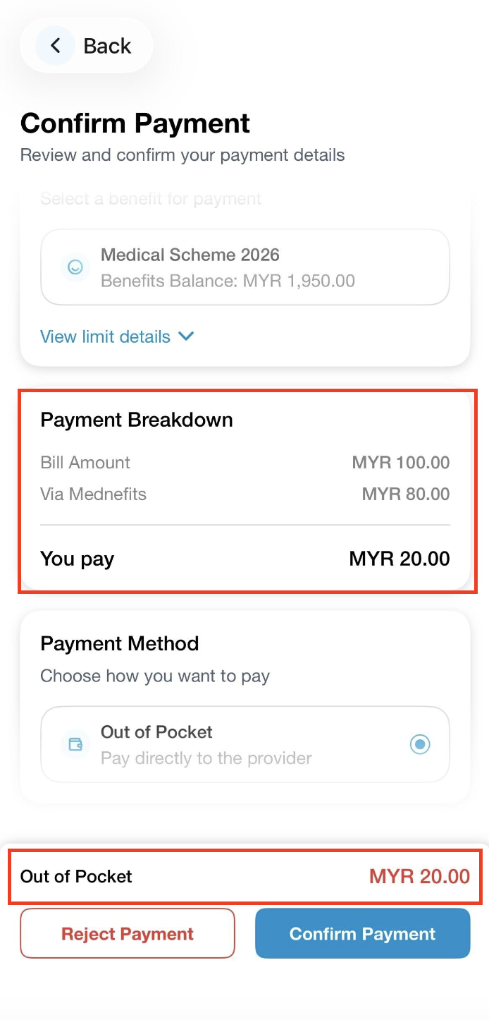❗In a case when there is a figure under Out of Pocket indicated in red, please pay the amount directly to the provider.