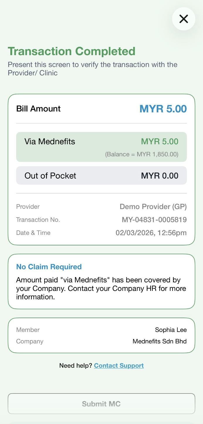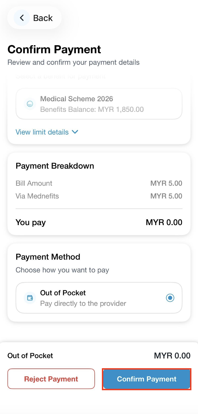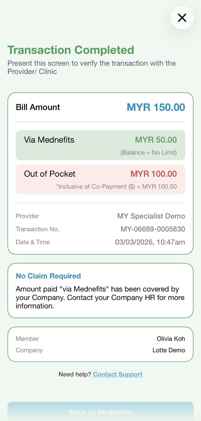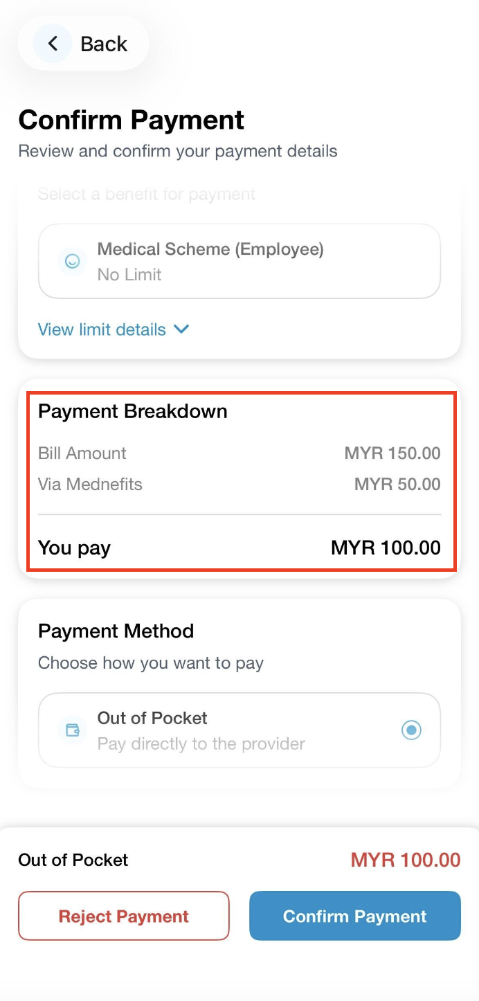 ❗Please take note of the Out of Pocket amount, as you need to pay the amount directly to the clinic. If no amount is shown, it indicates total cost will be paid via Mednefits.