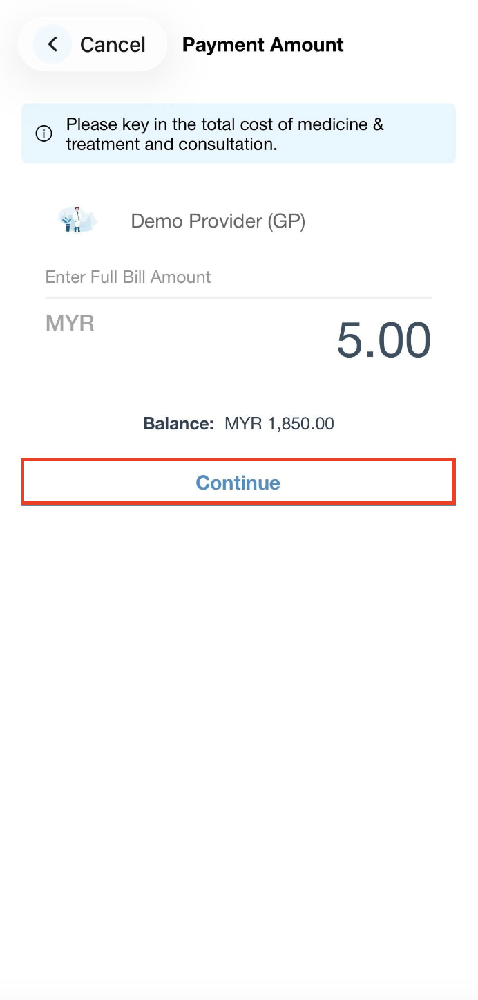 Step 4: On the Payment Amount page, please key in the payable amount (total cost of medicine & treatment, and consultation) told by the provider and click Continue.