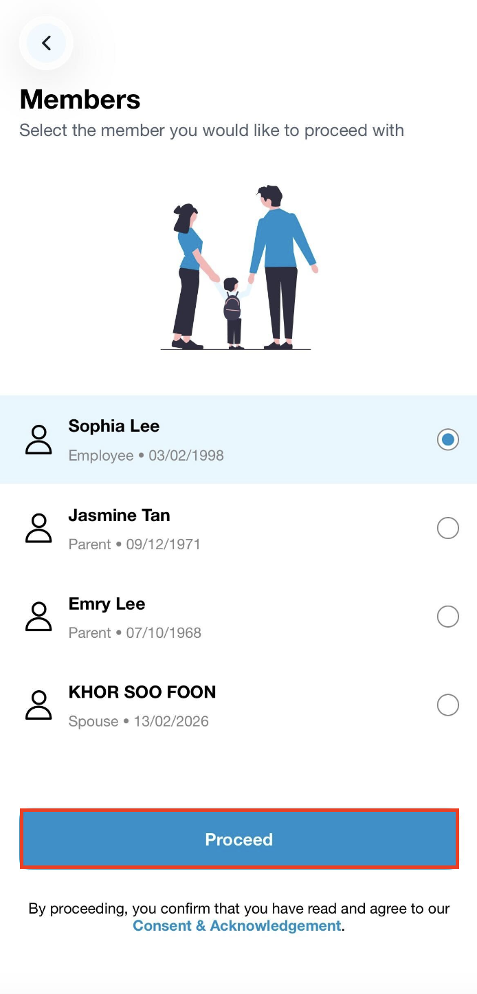 Step 1: Tap on Scan QR to scan the QR code present at the provider and select the registered member's name including your dependents (if available) before clicking on Proceed.