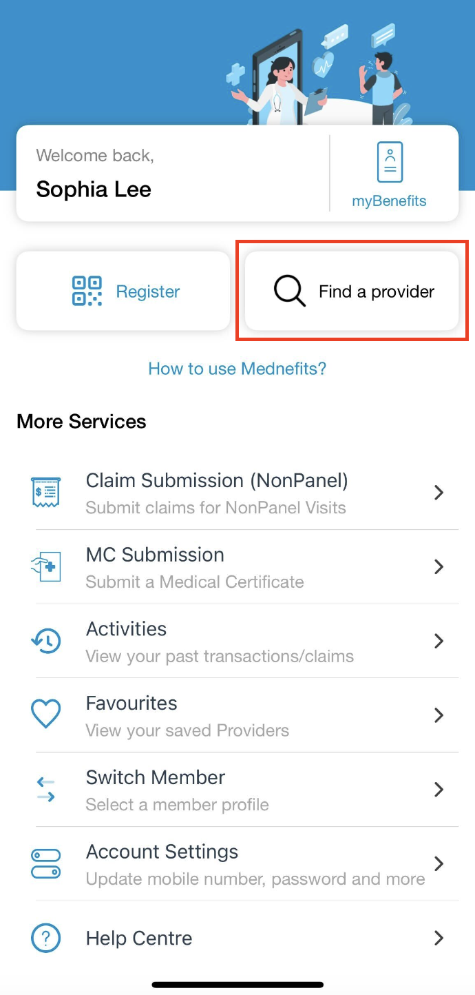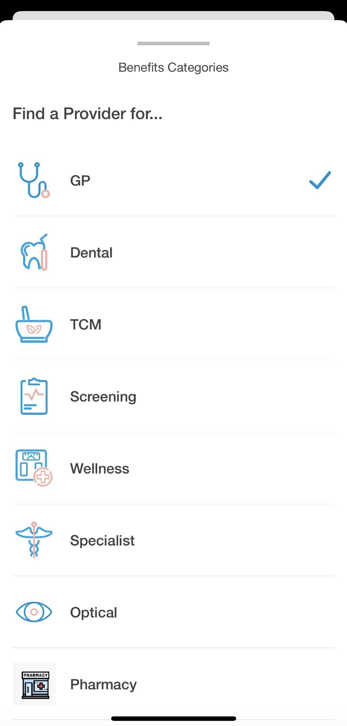 Step 1: On the Mednefits app home screen, click on Find a provider, select the available category of health provider.