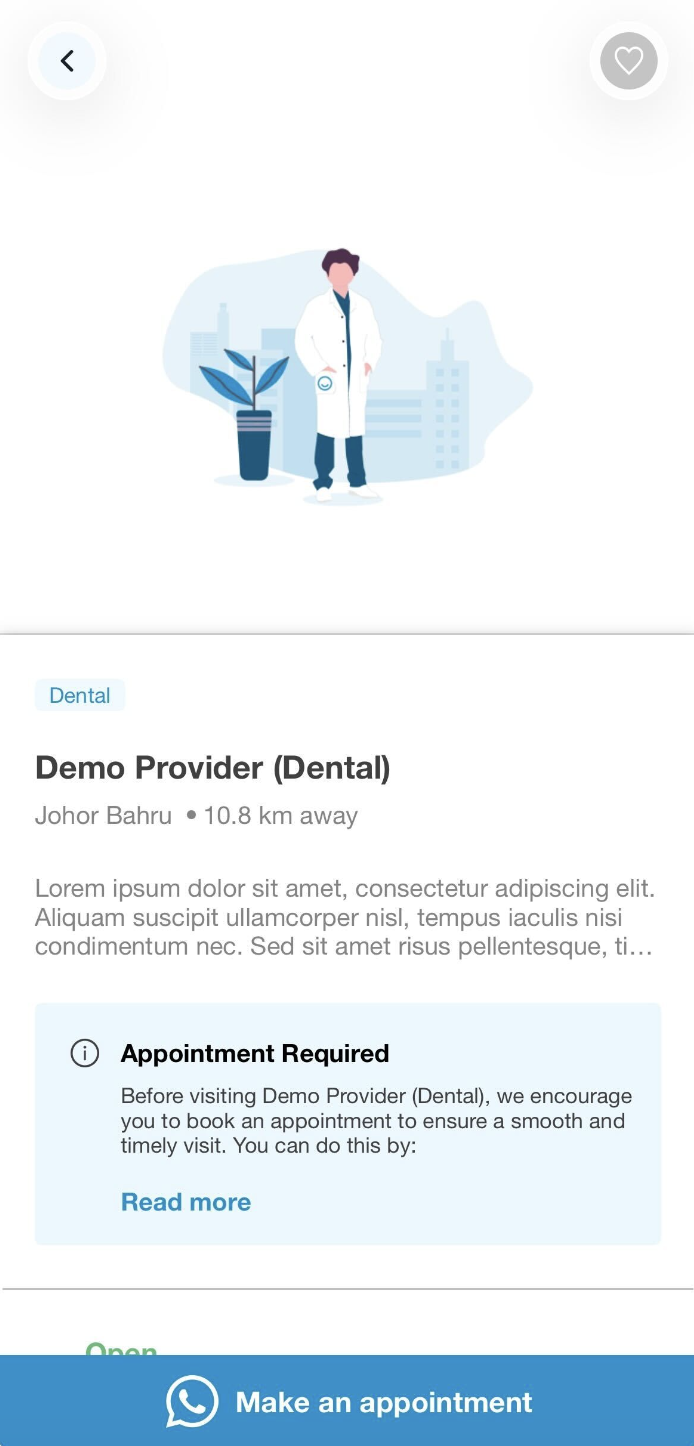 Click on Make an appointment to access the clinic's WhatsApp, and arrange your appointment seamlessly. For providers that require an appointment, we strongly encourage you to read and follow the complete procedure outlined in the provider's profile (if available) to ensure a smooth visit. To view the detailed instructions on how to book an appointment, simply click on Read More.