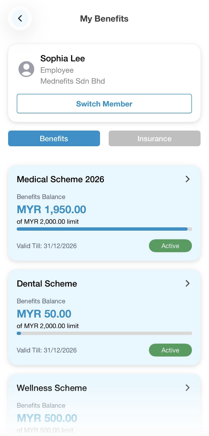 You can view your benefits balance or entitlement from either the Mednefits Mobile App or the Mednefits Member Portal.