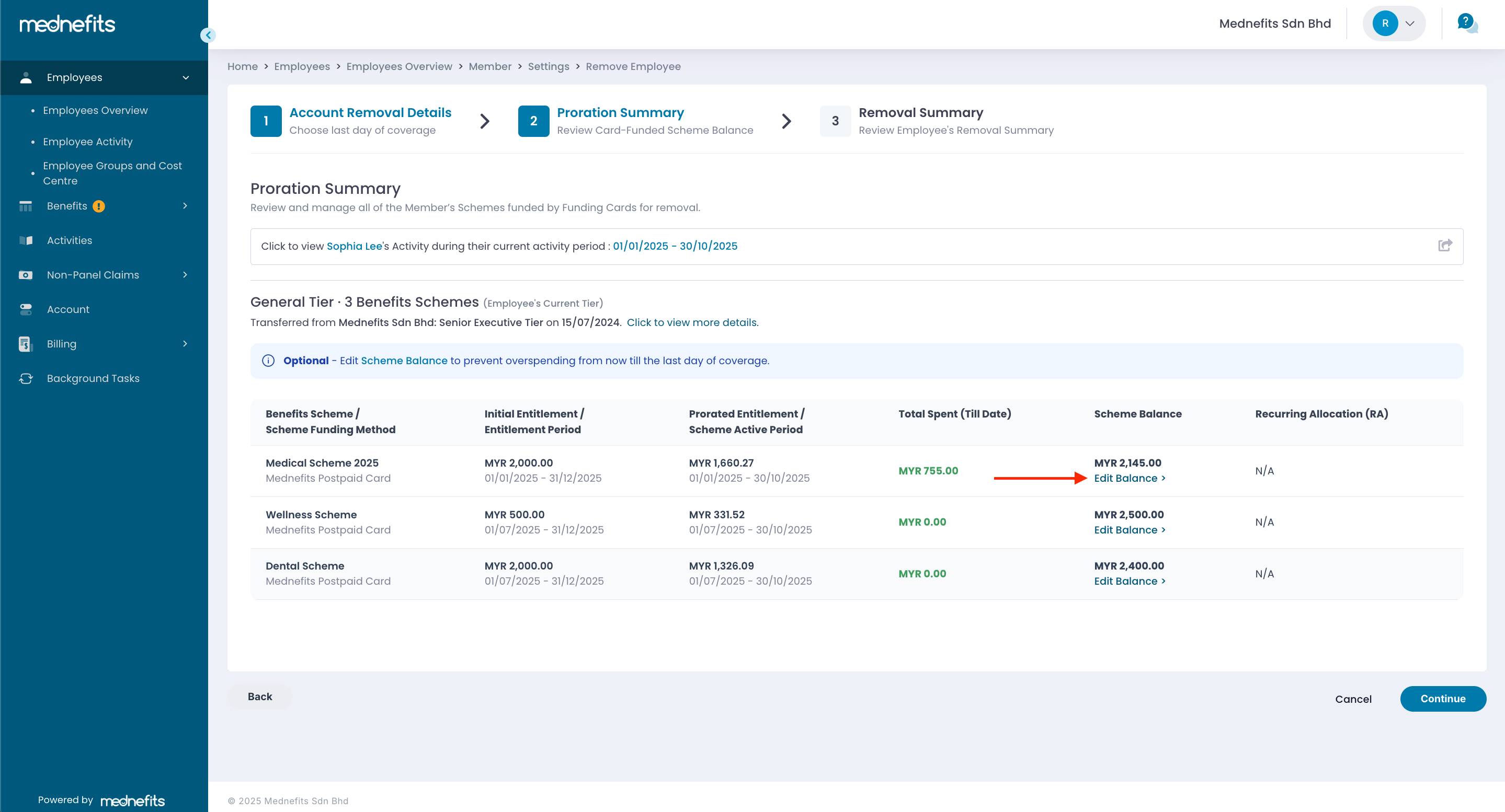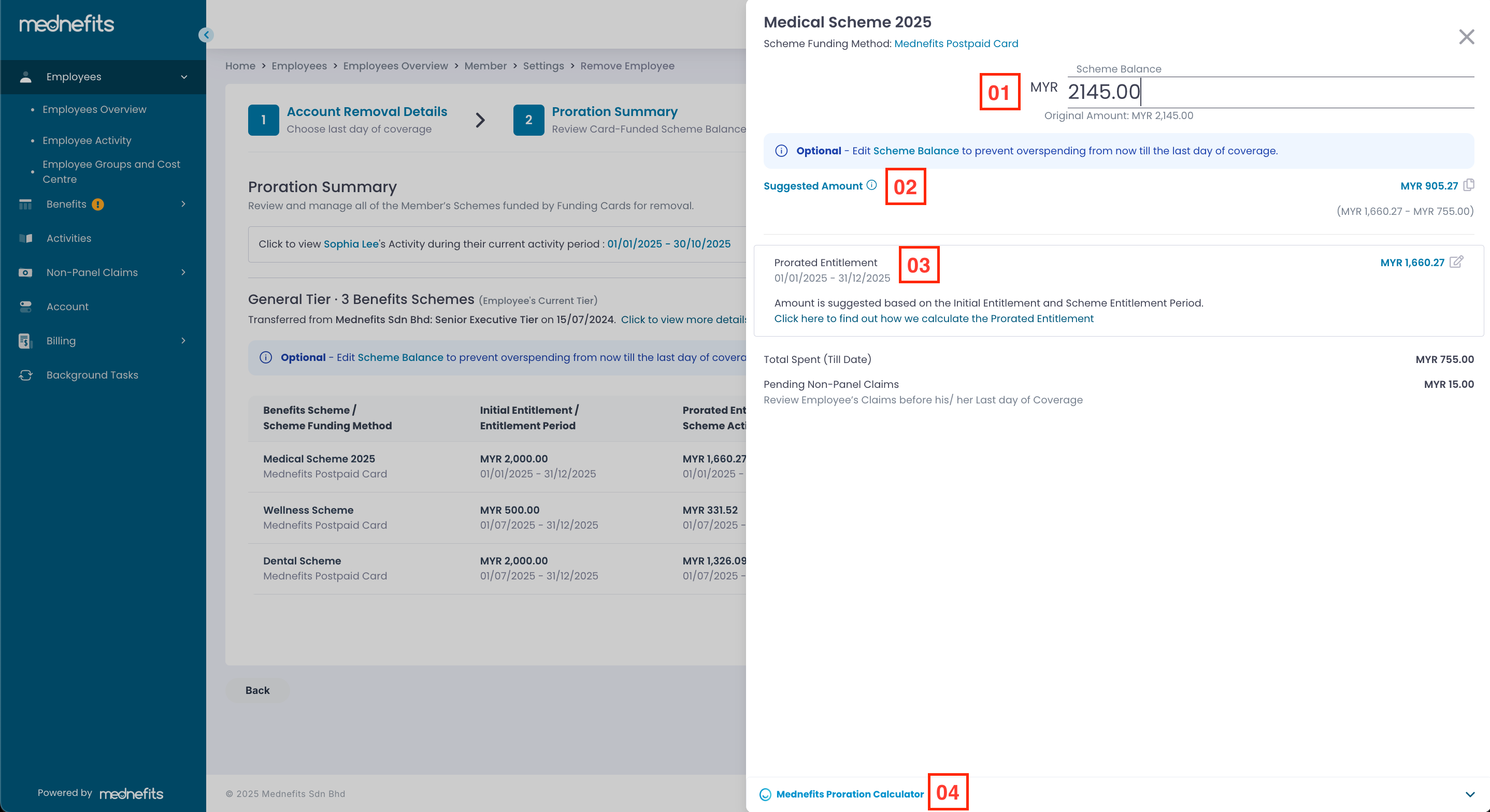 - 01 Scheme Balance (Editable): Current Scheme Balance will be displayed by default. Edit scheme balance if you’d like to increase/ decrease member’s scheme balance from today until employee’s last day of coverage.