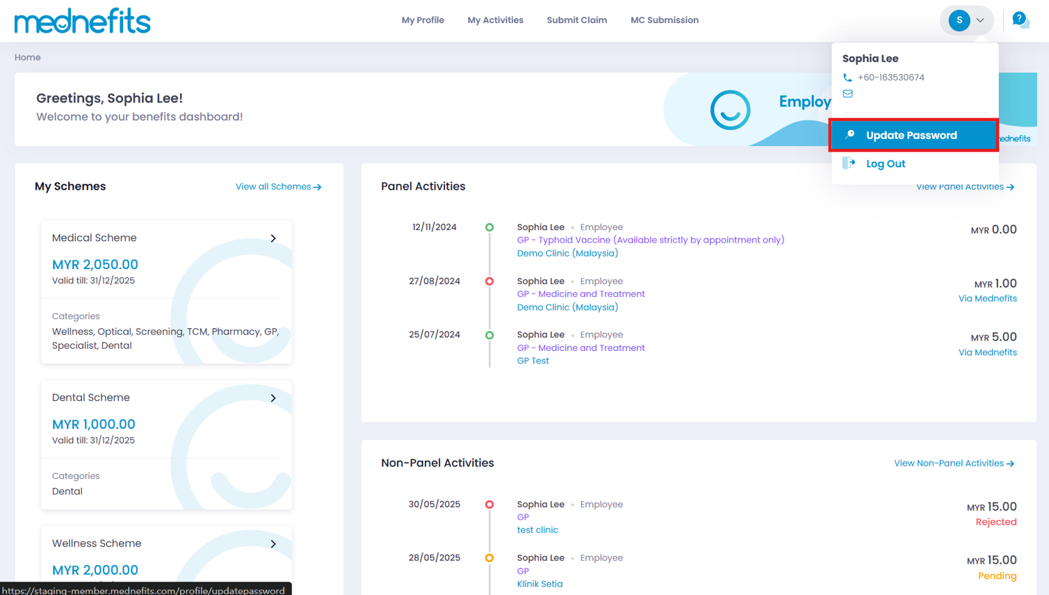 Step 1: Click on My Profile on your Mednefits Dashboard and select Update Password from the bottom left corner.