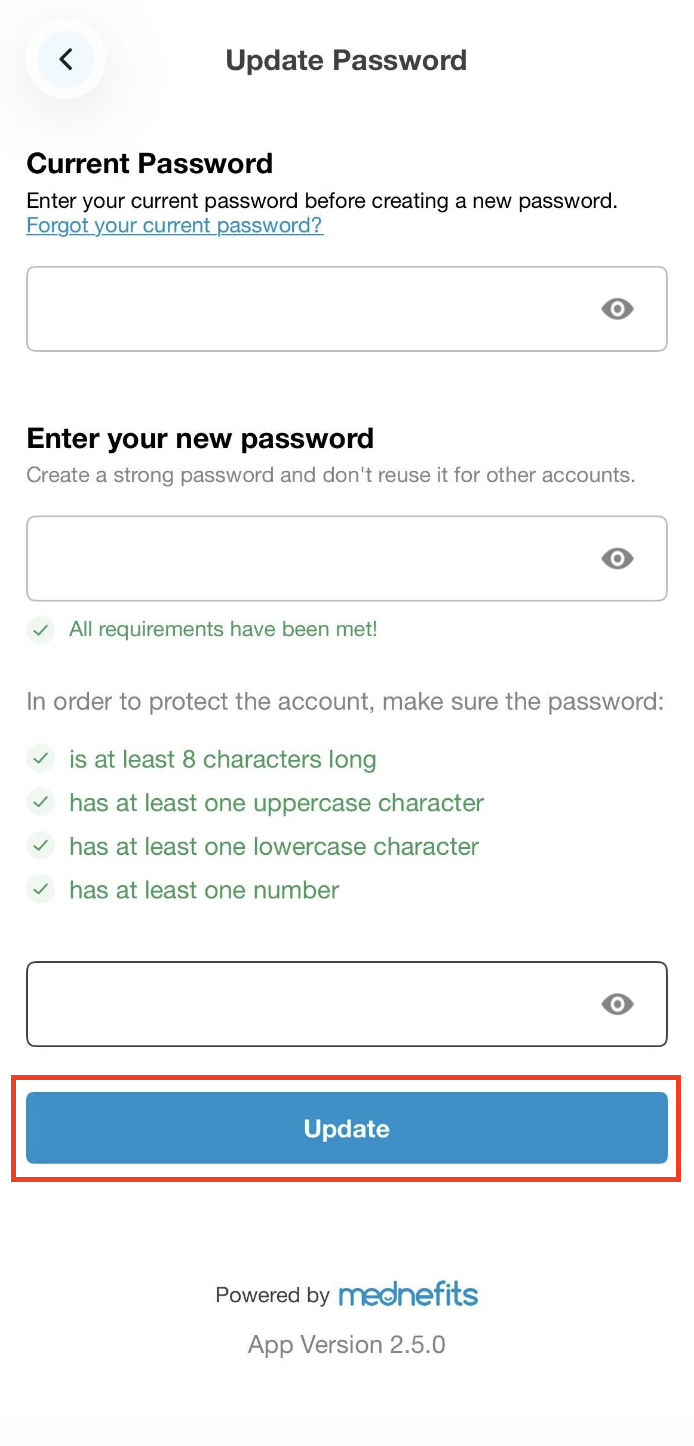 Step 3: Proceed to update your password by entering your current password, then enter your new password twice and click Update. Your new password must meet the criteria below for maximum security: