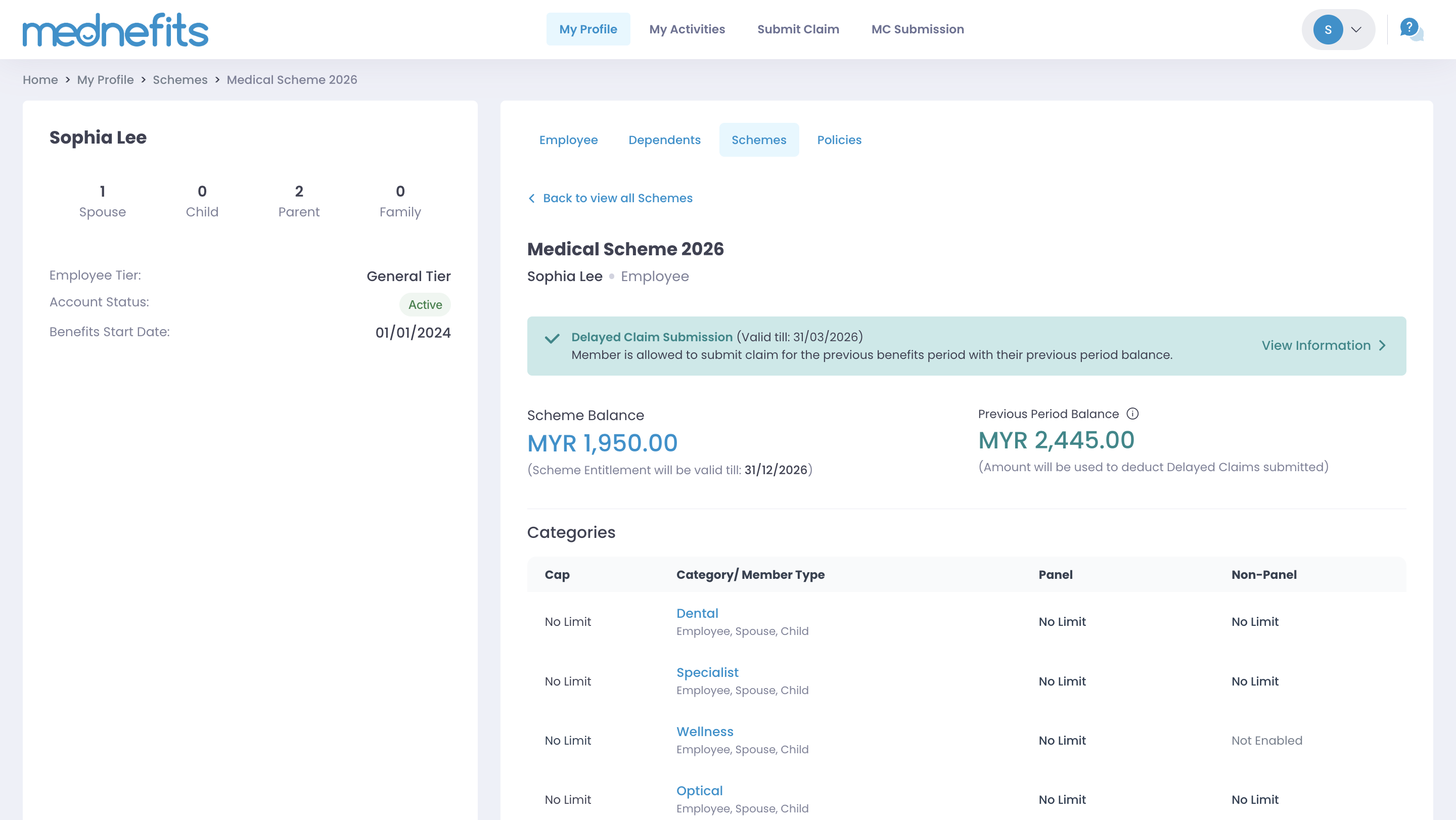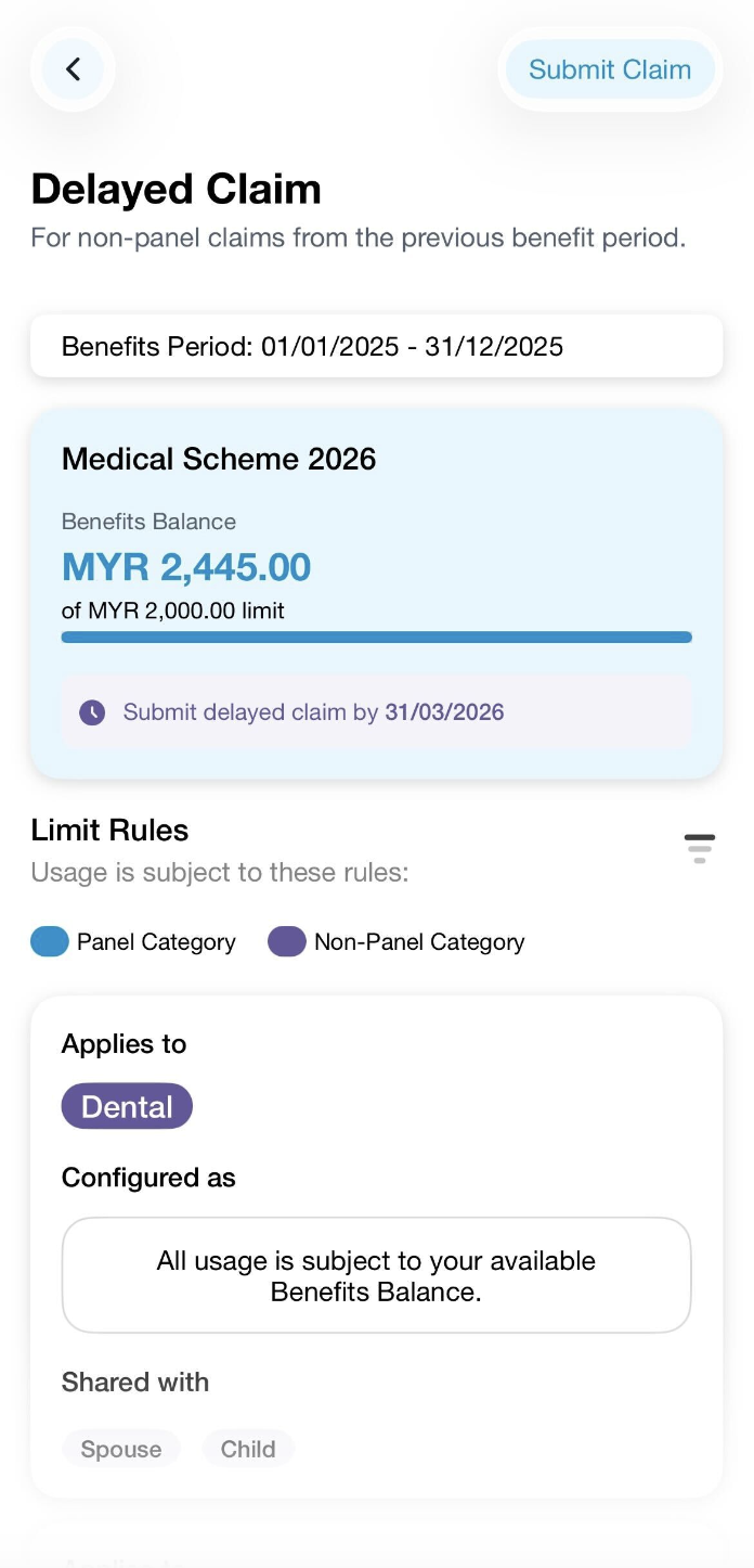 Step 3: You may view the full details of the coverage available under the scheme. You may also view if there is any Delayed Claim Submission available that allows you to submit claims for the previous benefits period.