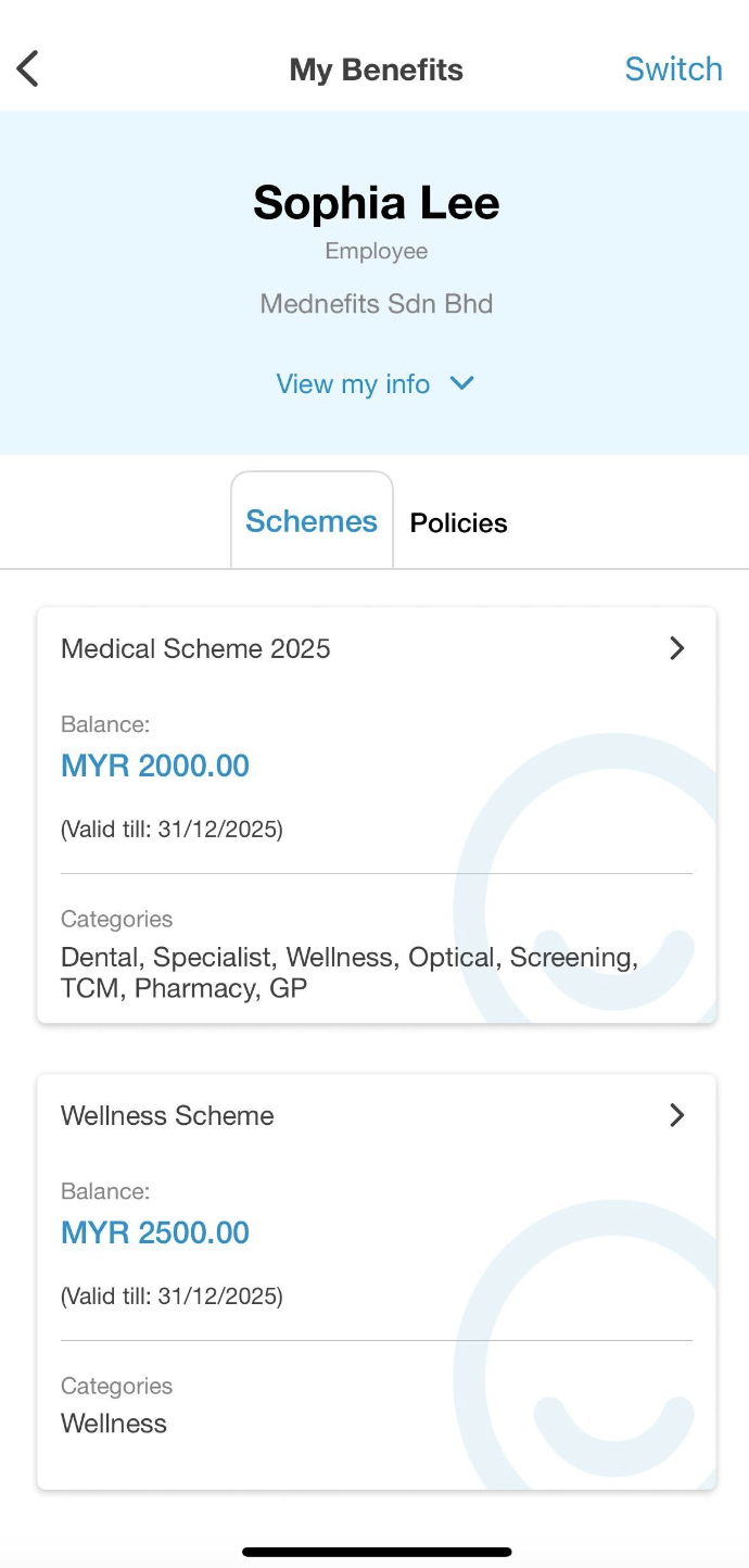 Step 2: Here is where you may view your personal Benefits, or click Switch to see other Dependents (if any) attached to your account. You should have a minimum of 1 Benefits Scheme. Please note that your Benefits Schemes may be titled differently, so click through to see the categories of benefits that apply. (if you have more than 1 Benefits Scheme)