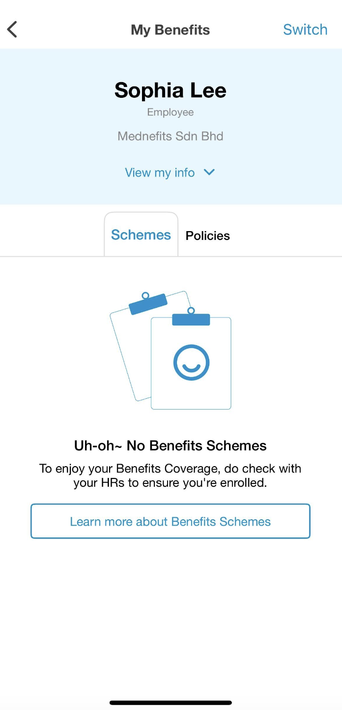 Uh oh! If you don't see any Benefits Schemes tied to your account, please reach out to your company HR directly.