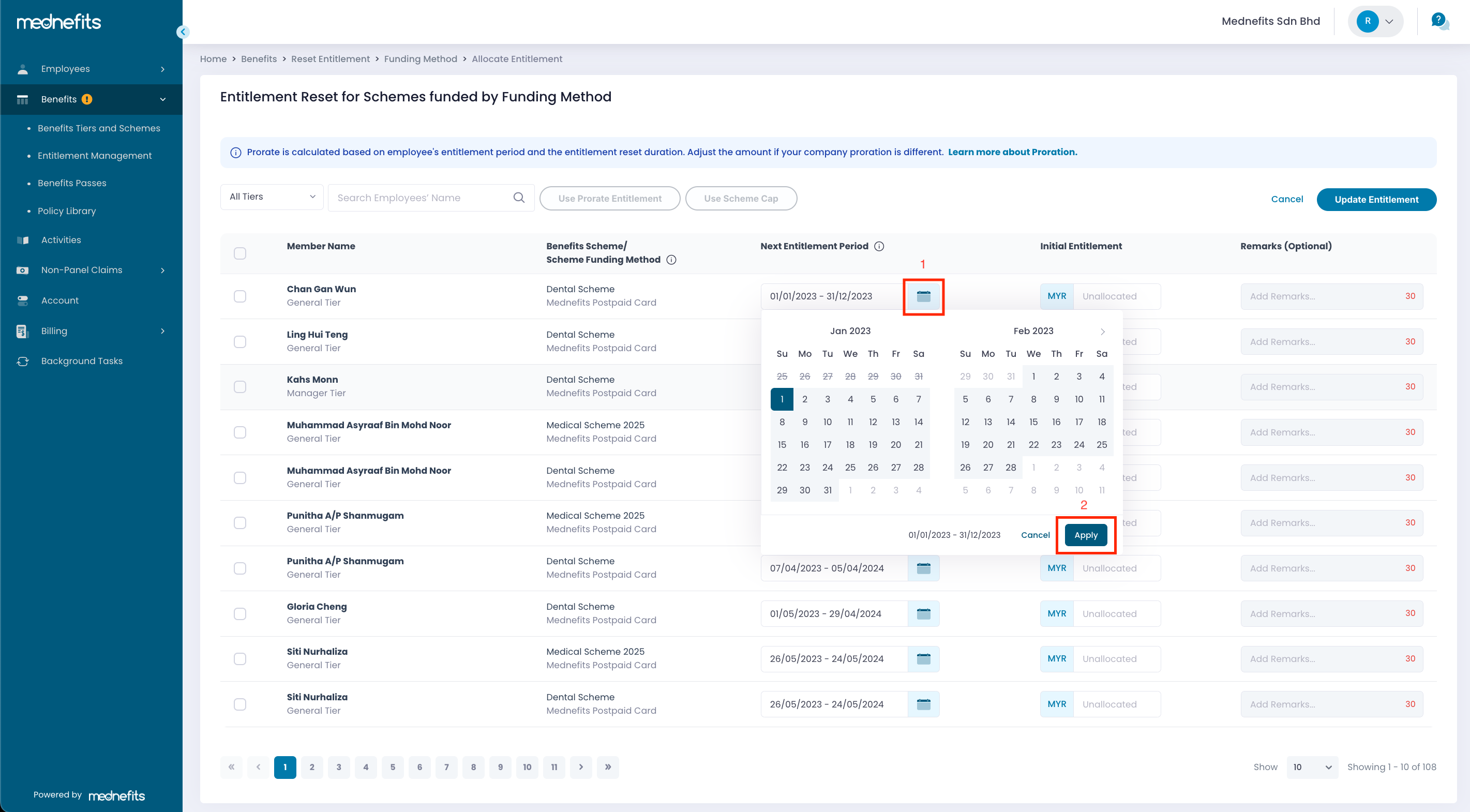 Simply click on the calendar icon to start editing the entitlement period and click on Apply once the entitlement period for the next benefits period has been confirmed.
