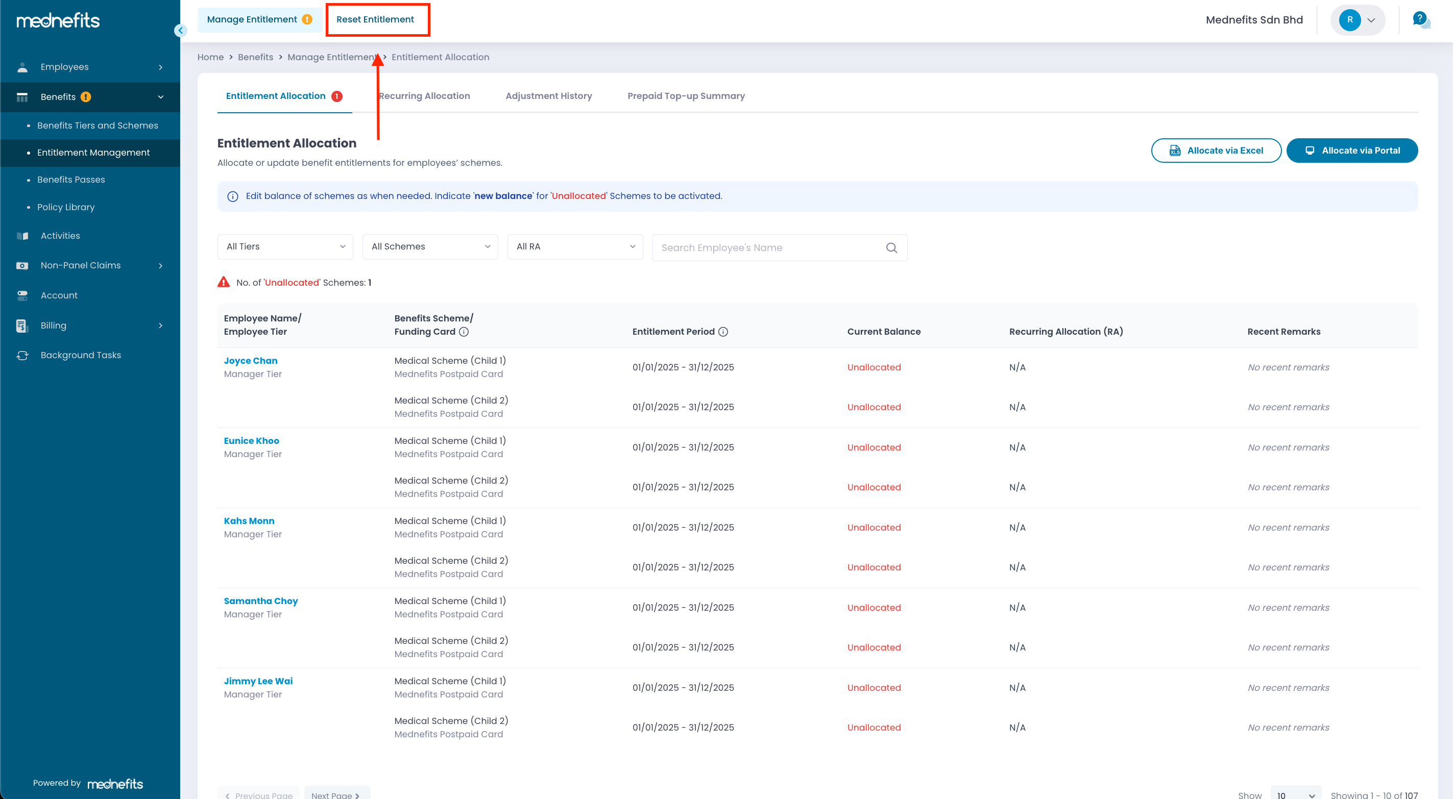 Step 1: Navigate to the Benefits tab > Entitlement Management > Reset Entitlement. Then click Allocate Entitlement to proceed.