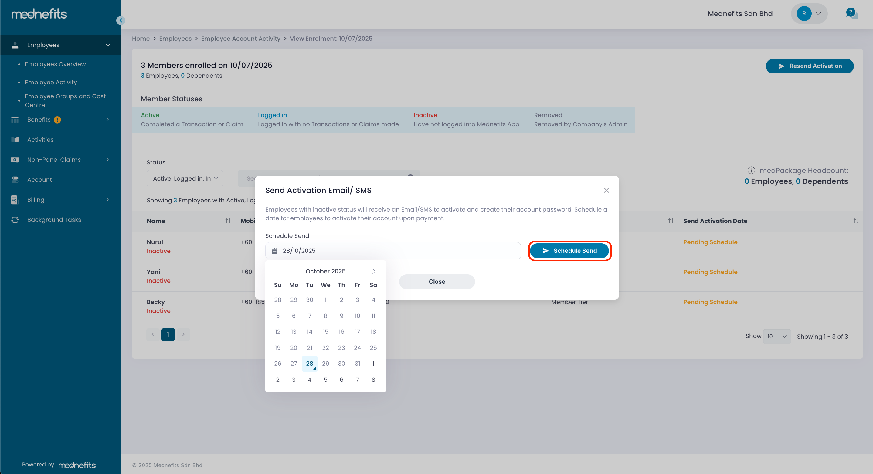 Step 2: Input a date for the system to send out the activation email/ SMS to the employee. Click Schedule Send to confirm the action.
