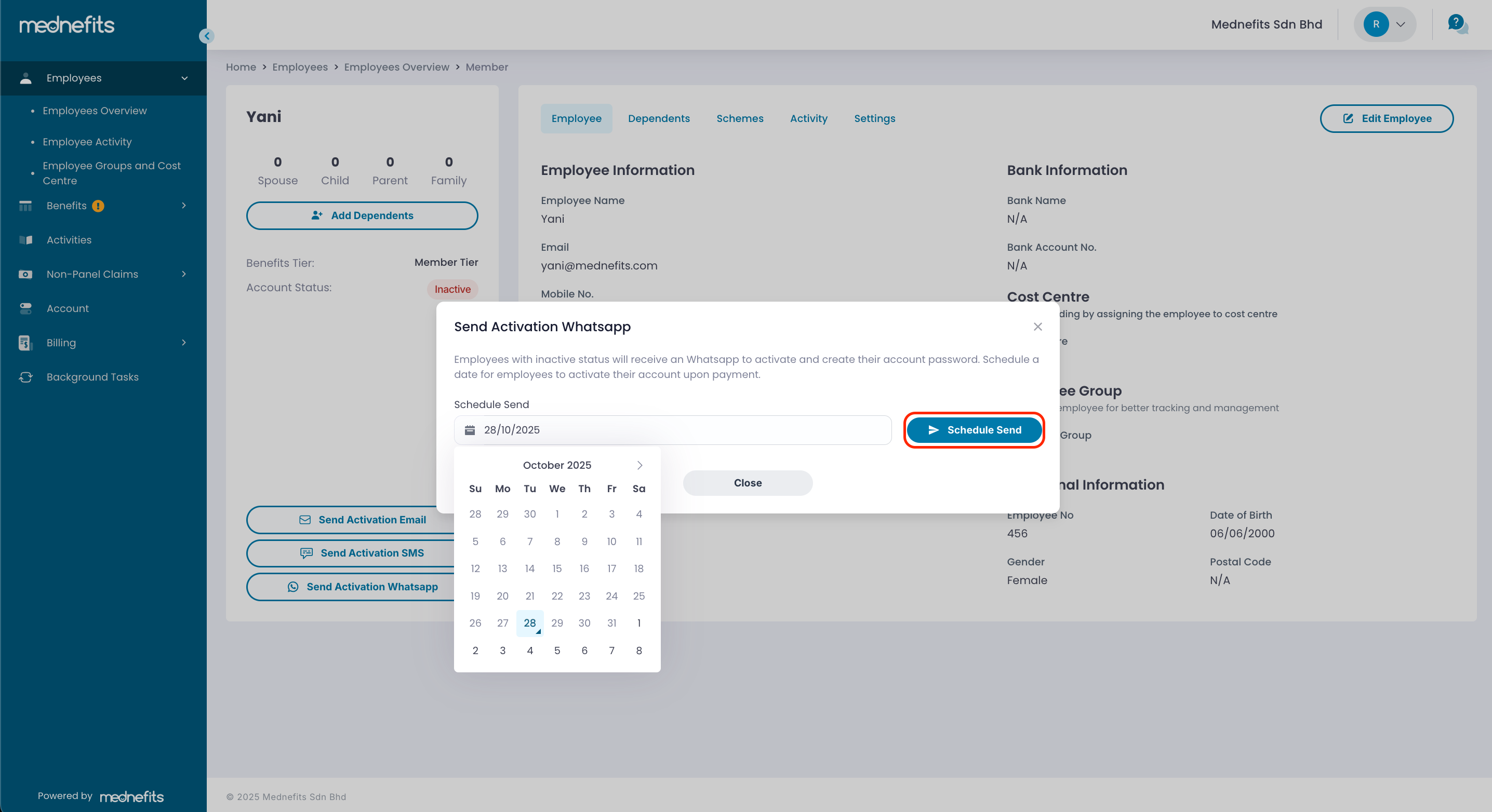 Step 3: Input a date for the system to send out the activation Email / SMS / Whatsapp to the employee. Click Schedule Send to confirm the action.