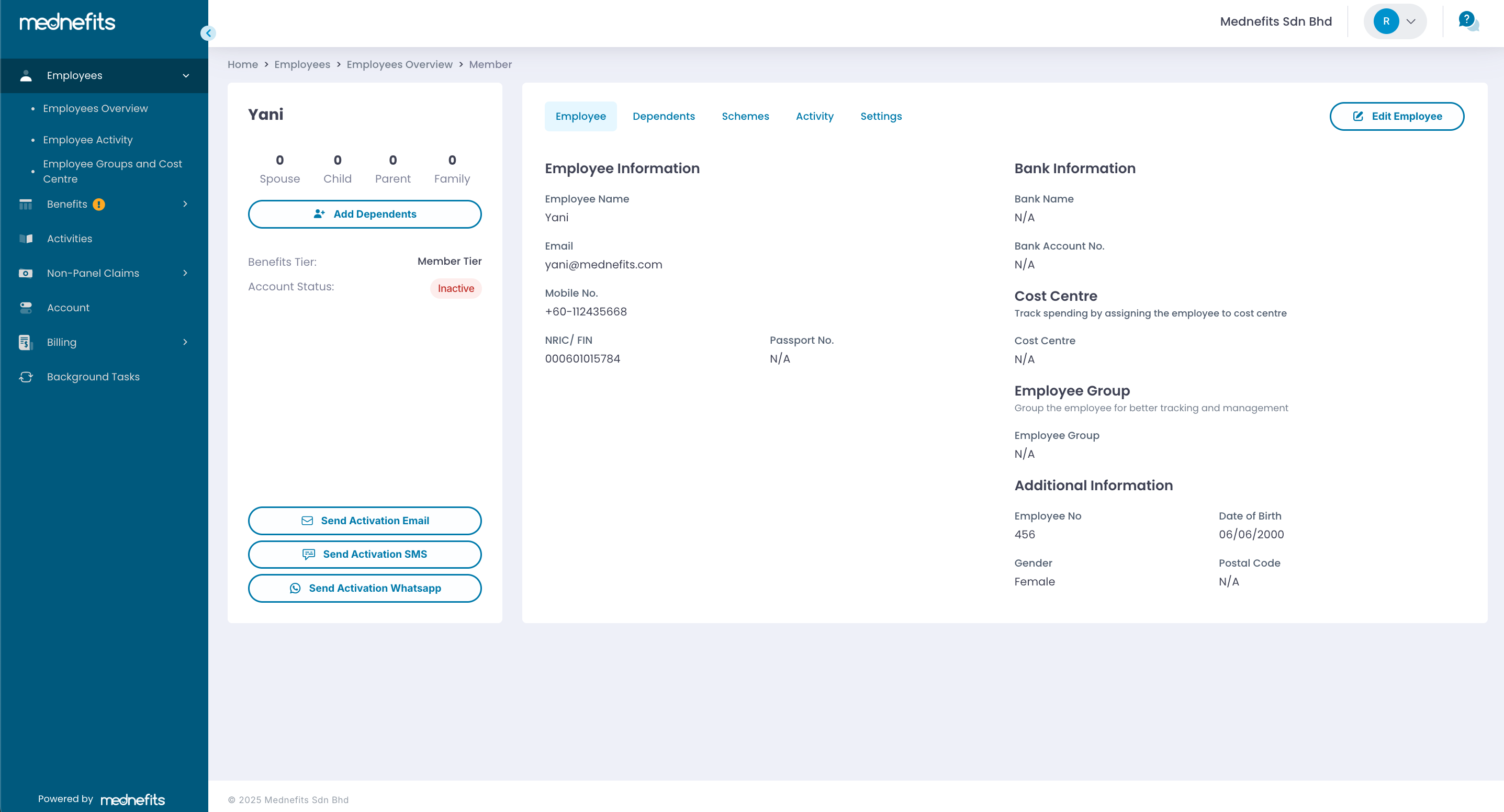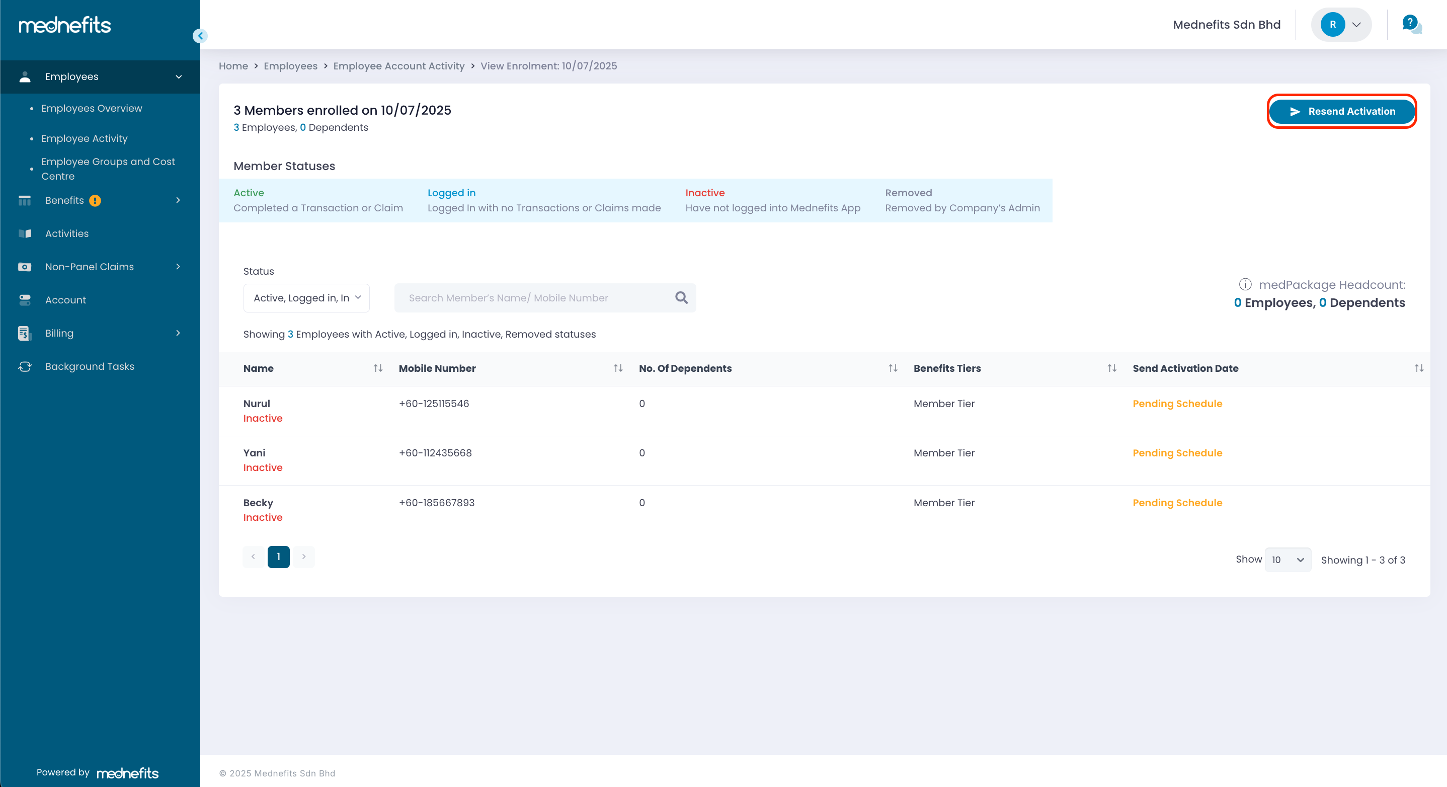 Activation email/ SMS can only be sent to employees with Inactive status. Inactive employees can install Mednefits App and activate their member account from the link attached to the activation email/ SMS.