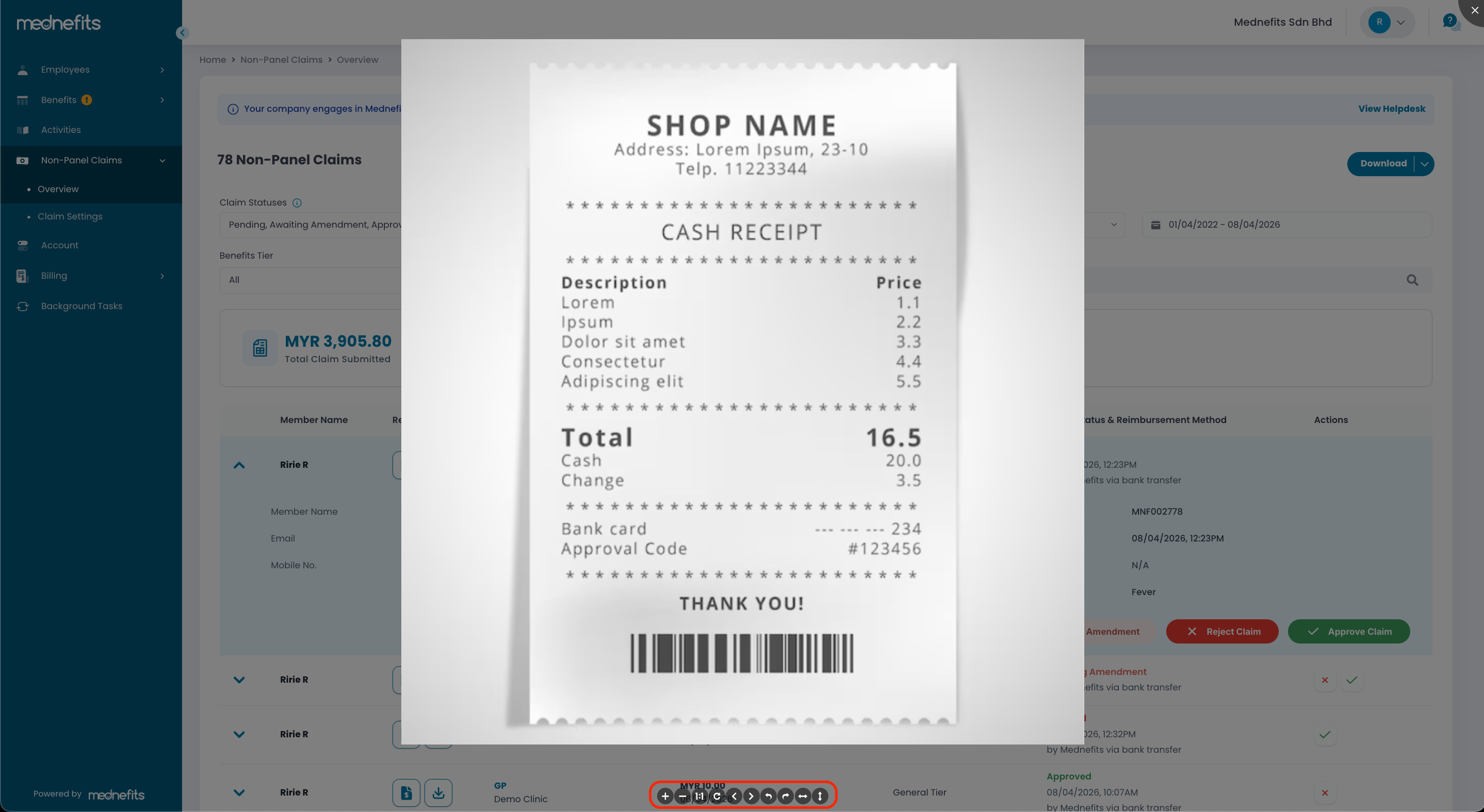 Step 3: Once you have reviewed the receipt, you may proceed to Reject, Approve or click Request Amendment to request employees to amend the claim before it is approved or rejected.