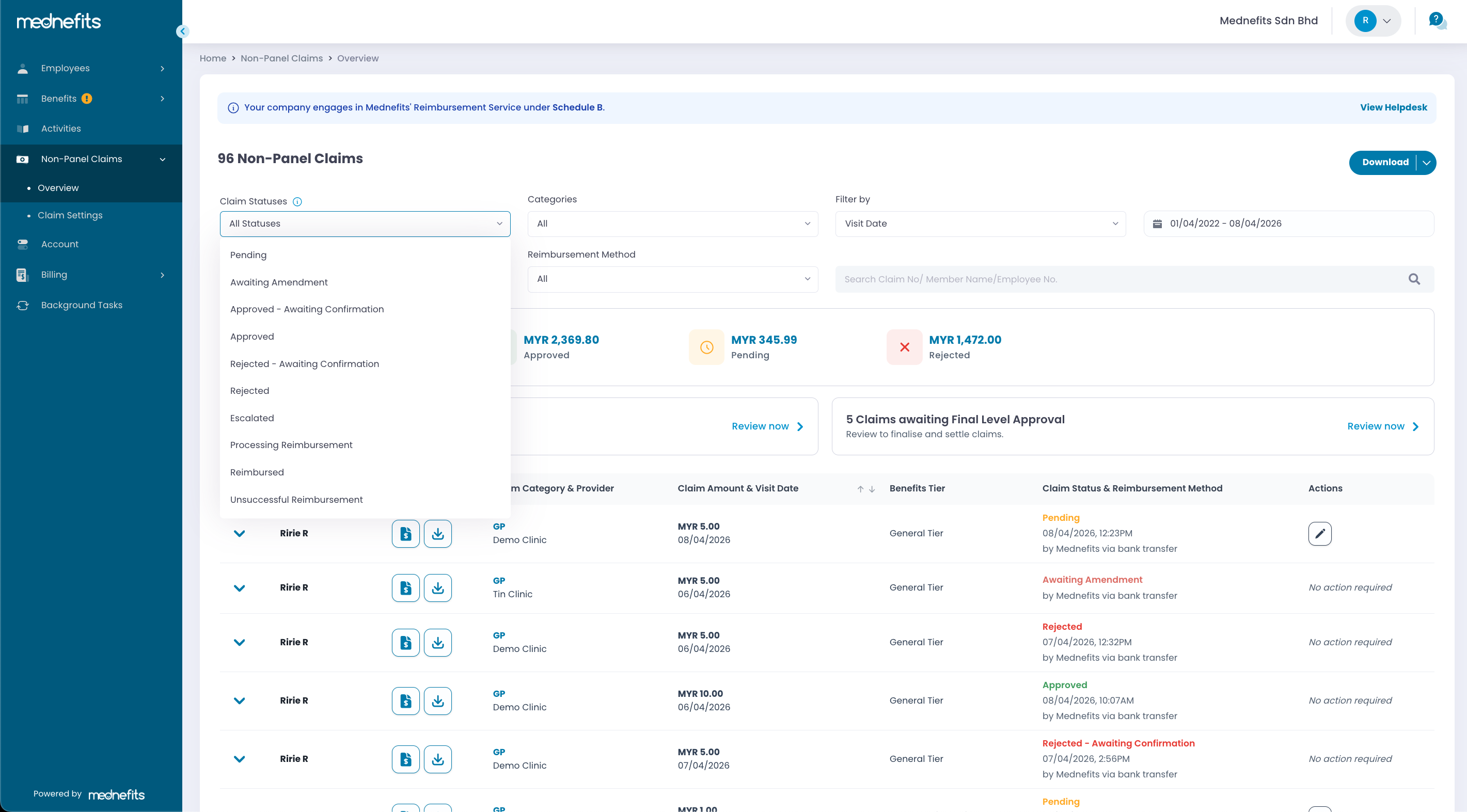 Once the administrator or HR approves a claim, the approved amount will be deducted from the employee's entitlement, and the balance will be updated. HR can process the reimbursement internally, or Mednefits will reimburse the employee if the company has appointed Mednefits to do so.