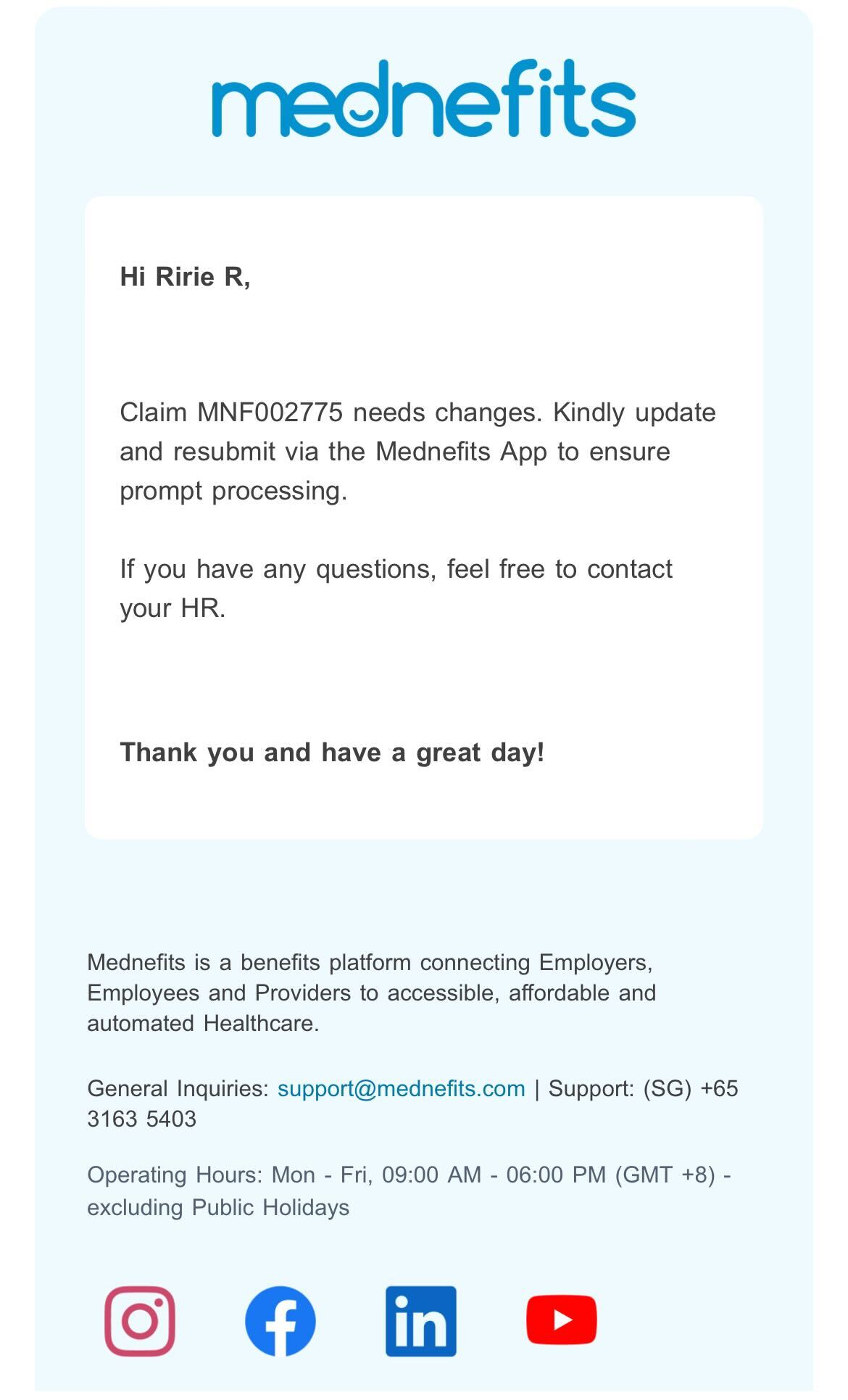 Admins can now request changes to pending claims directly from the HR Portal. Once a request is made, employees will receive a push notification and email, prompting them to edit and resubmit their claim via the Mednefits App.