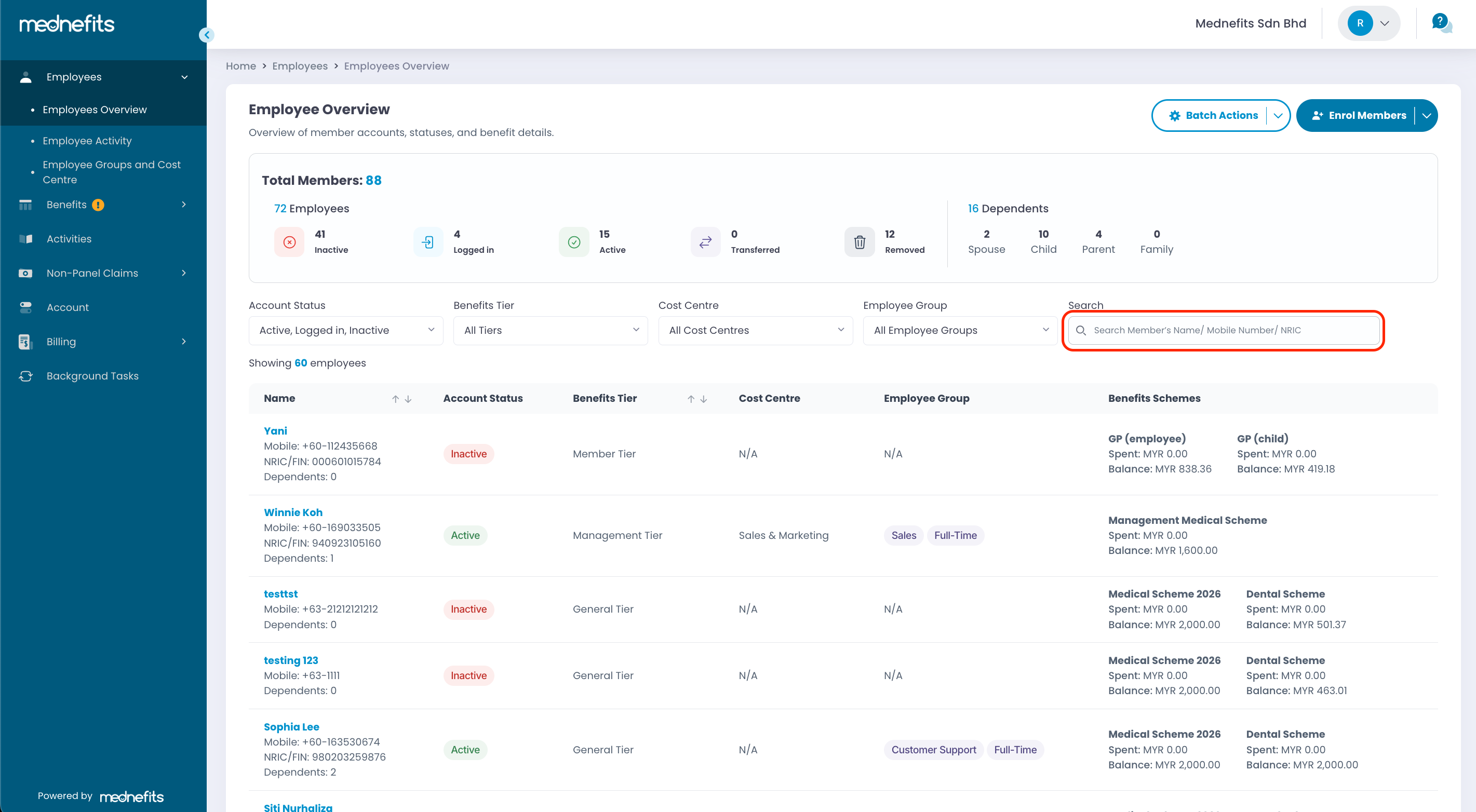 Step 1: On the Employees > Employees Overview page, search for the respective employee's account by their name, mobile number or NRIC.