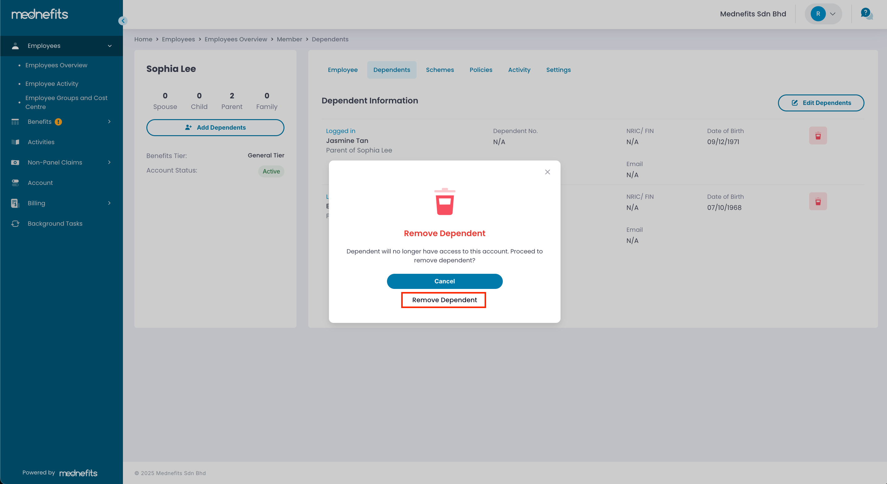 Step 3: Click Remove Dependent to confirm this action and the dependent will be removed permanently.