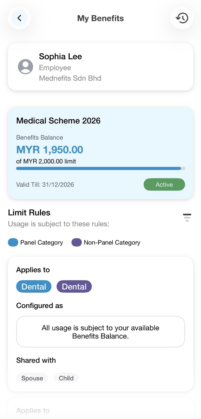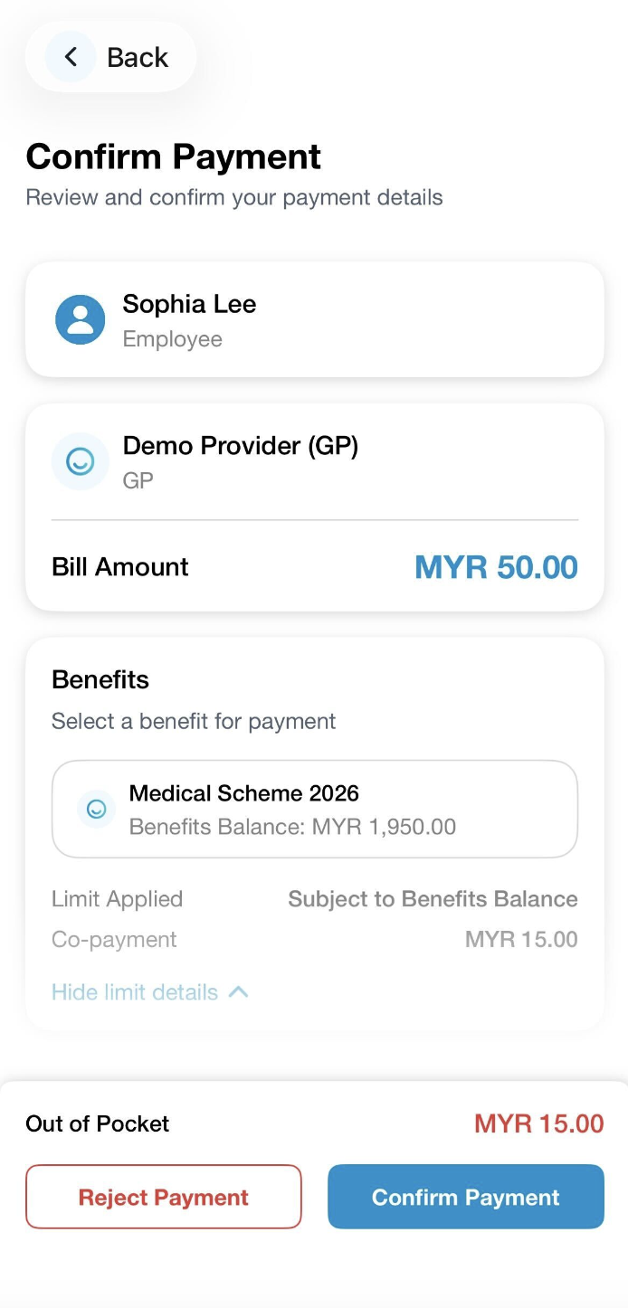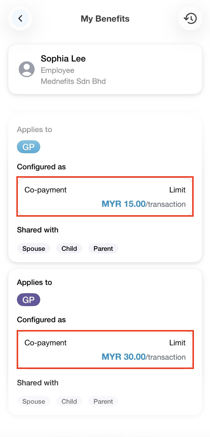 Your employer can set a Co-Payment on your Mednefits account. You can check it via your Mednefits app, simply go to View All Benefits and select any scheme under Benefits to see if your employer has enabled the Co-Payment settings.