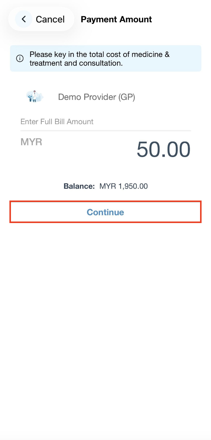 Step 5: On the Payment Amount page, enter the full bill size amount (inclusive of medicine & treatment and consultation fee) and press Continue.