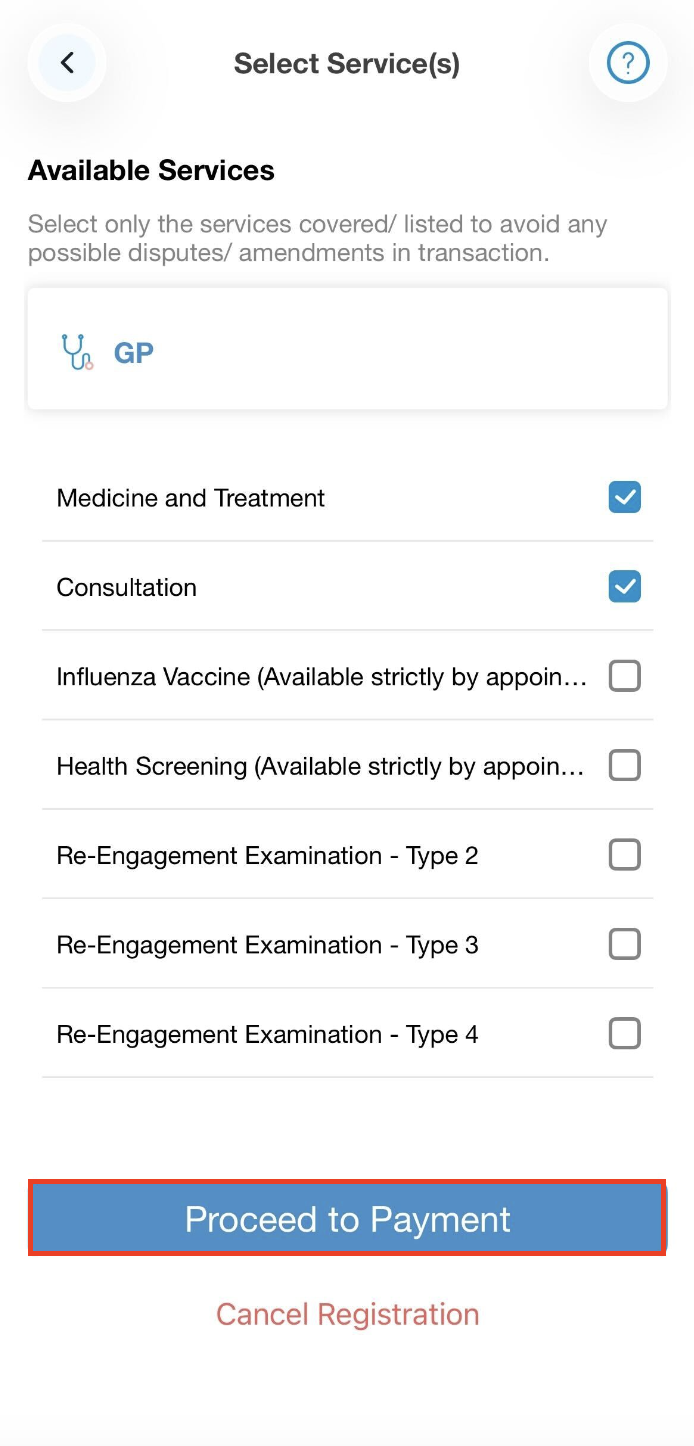 Step 4: The Checkout button will replace the Scan QR button to indicate that you have yet to checkout. When you are ready to checkout, tap the Checkout button, and on Select Service(s) page, select the services you have received before clicking on Proceed to Payment. (This page won't be displayed if the provider has only one service to offer)