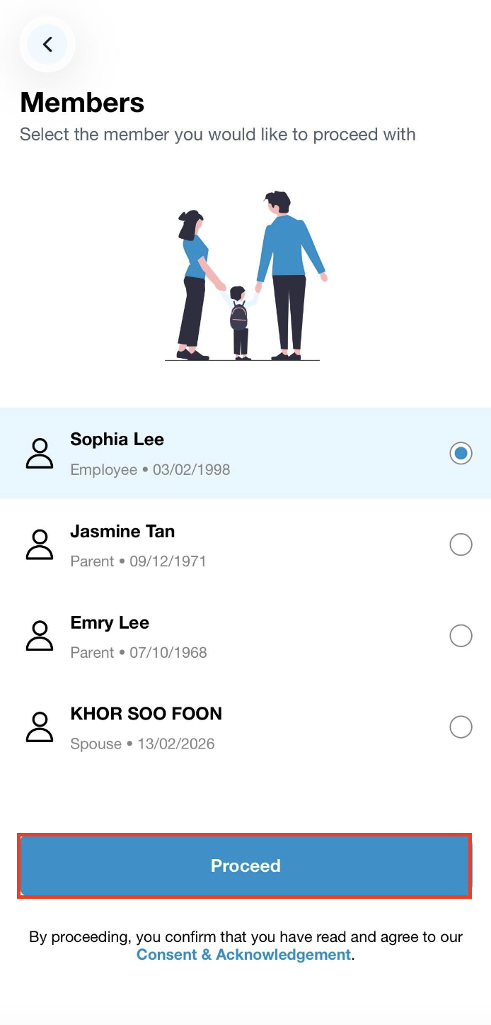 Step 2: On the member selection page (if applicable), select the member's name, and then click on Proceed.