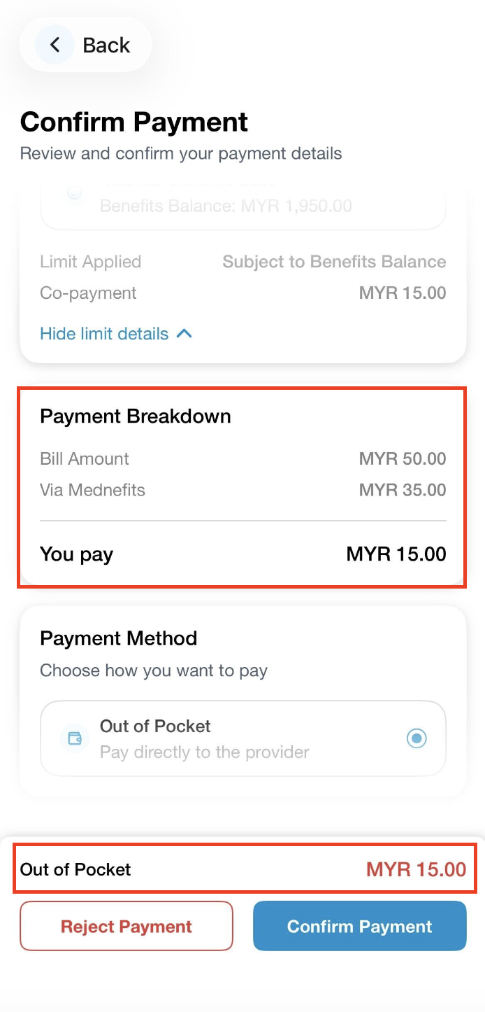 The Co-Payment refers to the fixed amount that you will be required to pay directly to the clinic or provider by cash/NETS/credit card for the visit. The remaining balance would be deducted from your benefits balance in a single transaction.