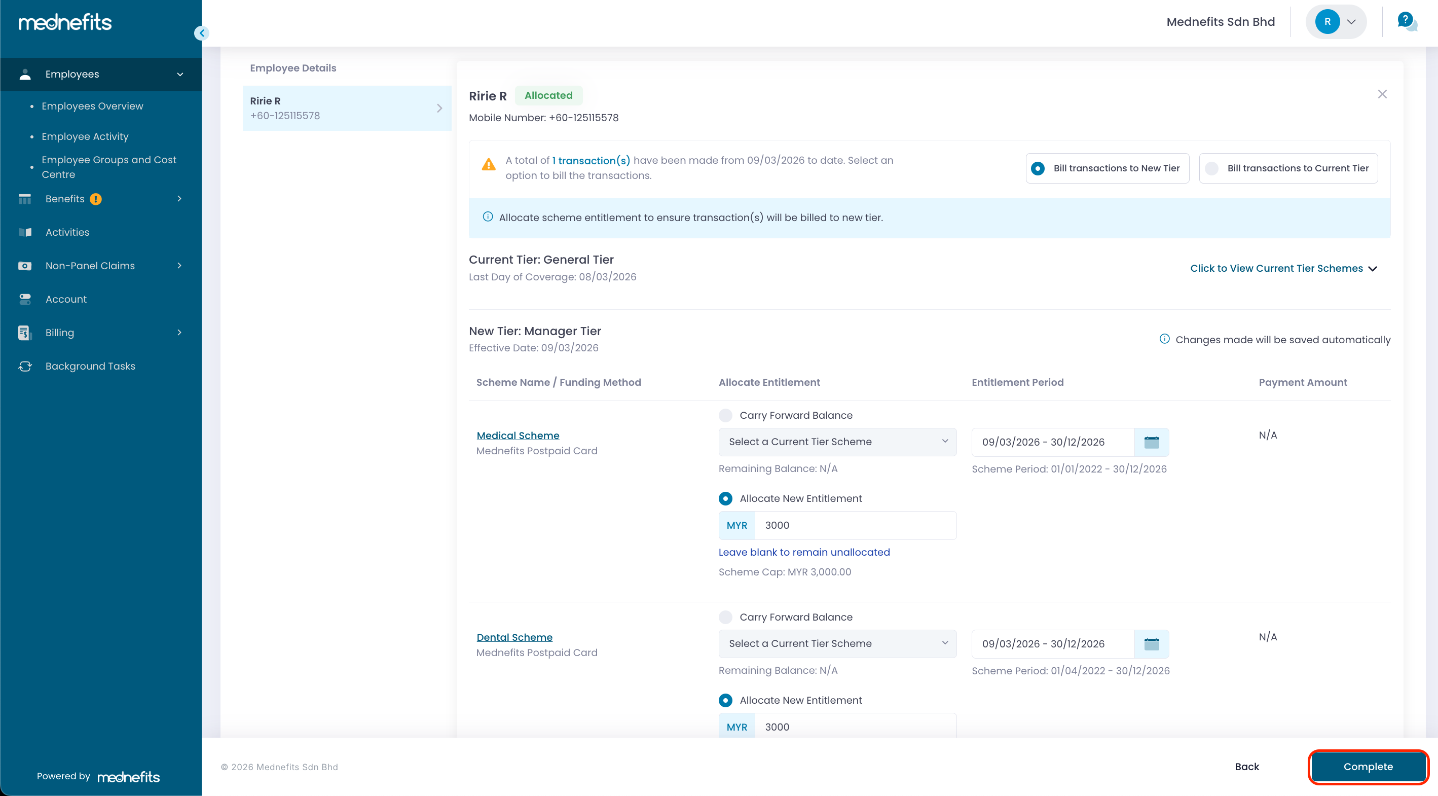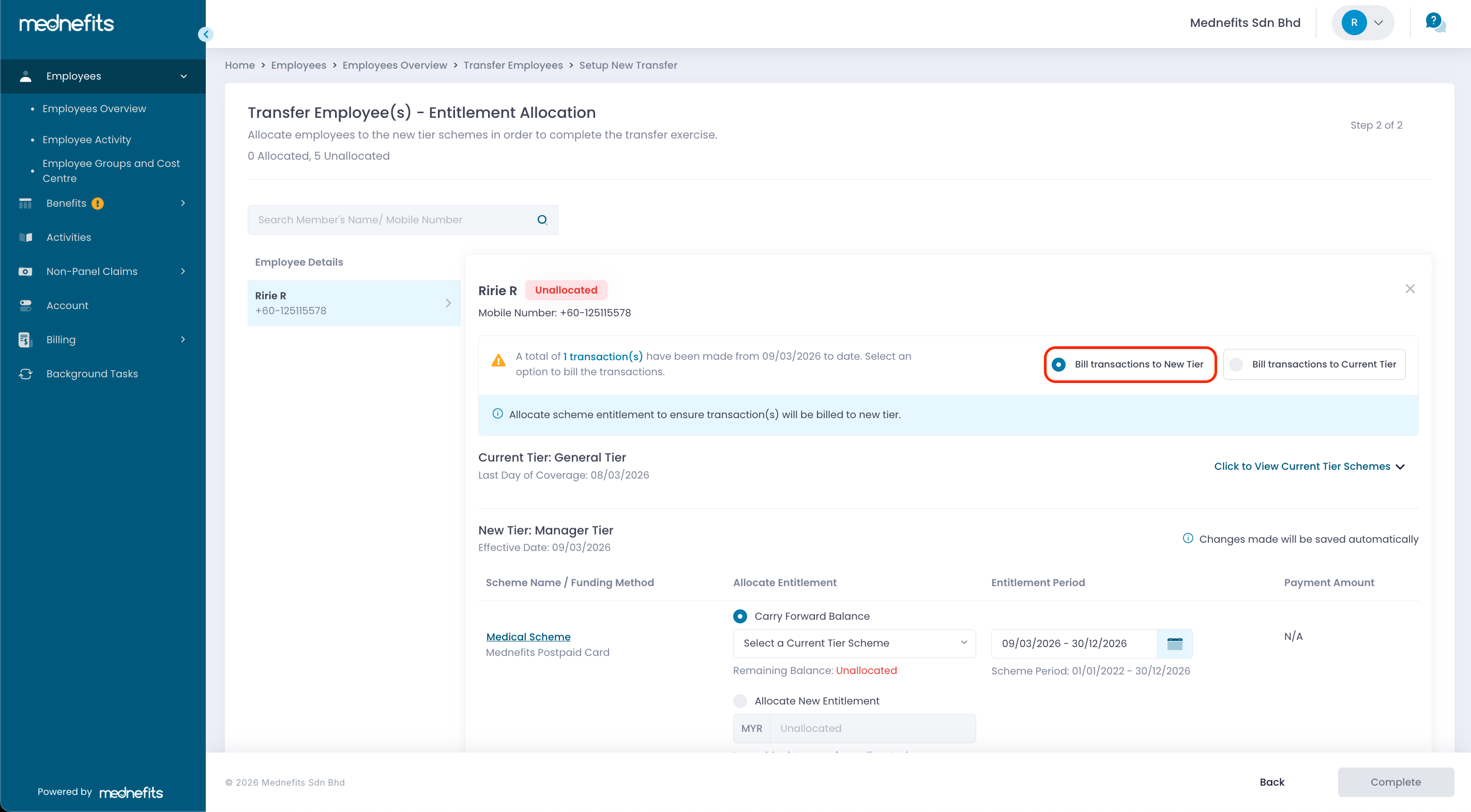 By selecting Bill transactions to New Tier, the Via Mednefits amount from these transactions will be refunded to employee’s old tier scheme, and deduct from the new tier scheme balance. Besides that, these transactions will be invoiced under the new tier.