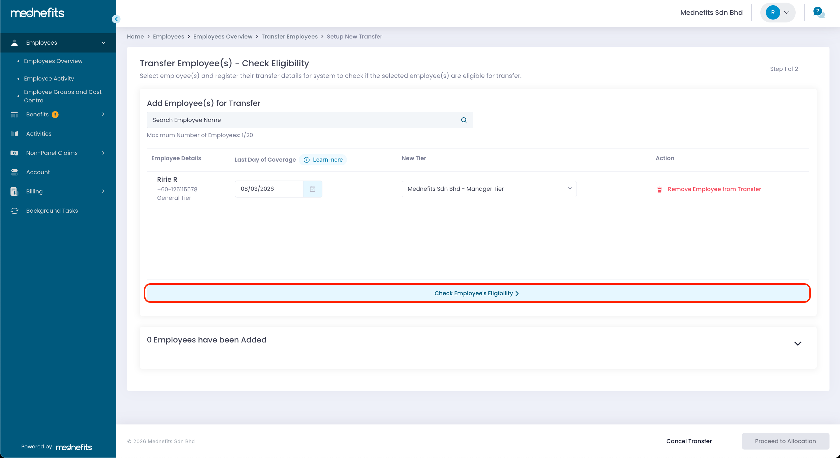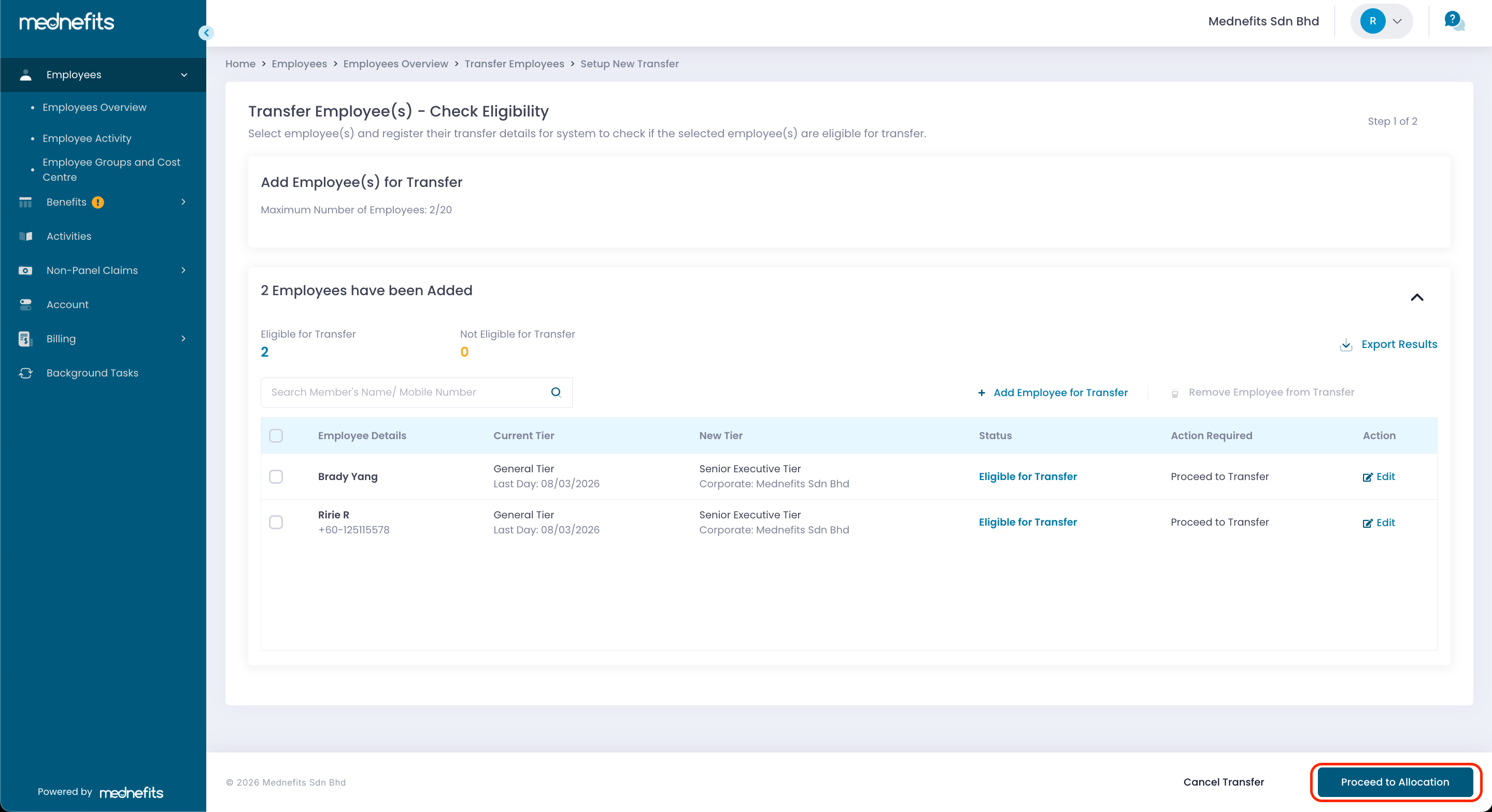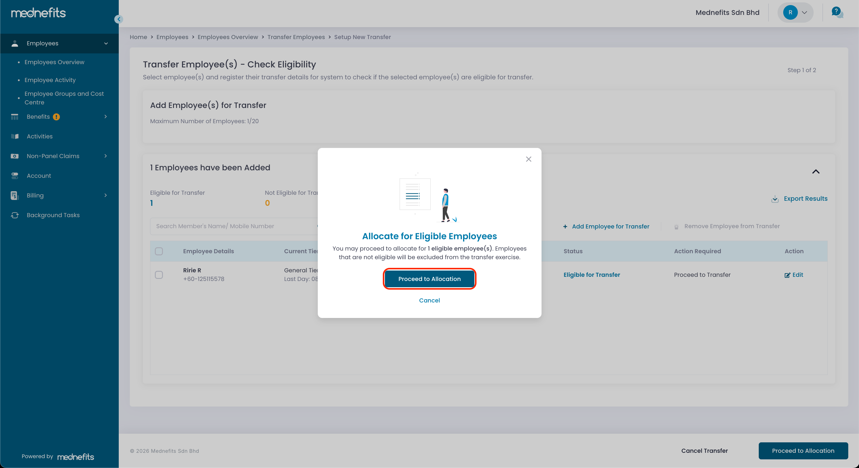 Step 5: This page displays the number of employees who are eligible for transfer. Click Proceed to Allocation to continue with the next steps. (For a smooth transfer process, kindly ensure that all claims have been processed).