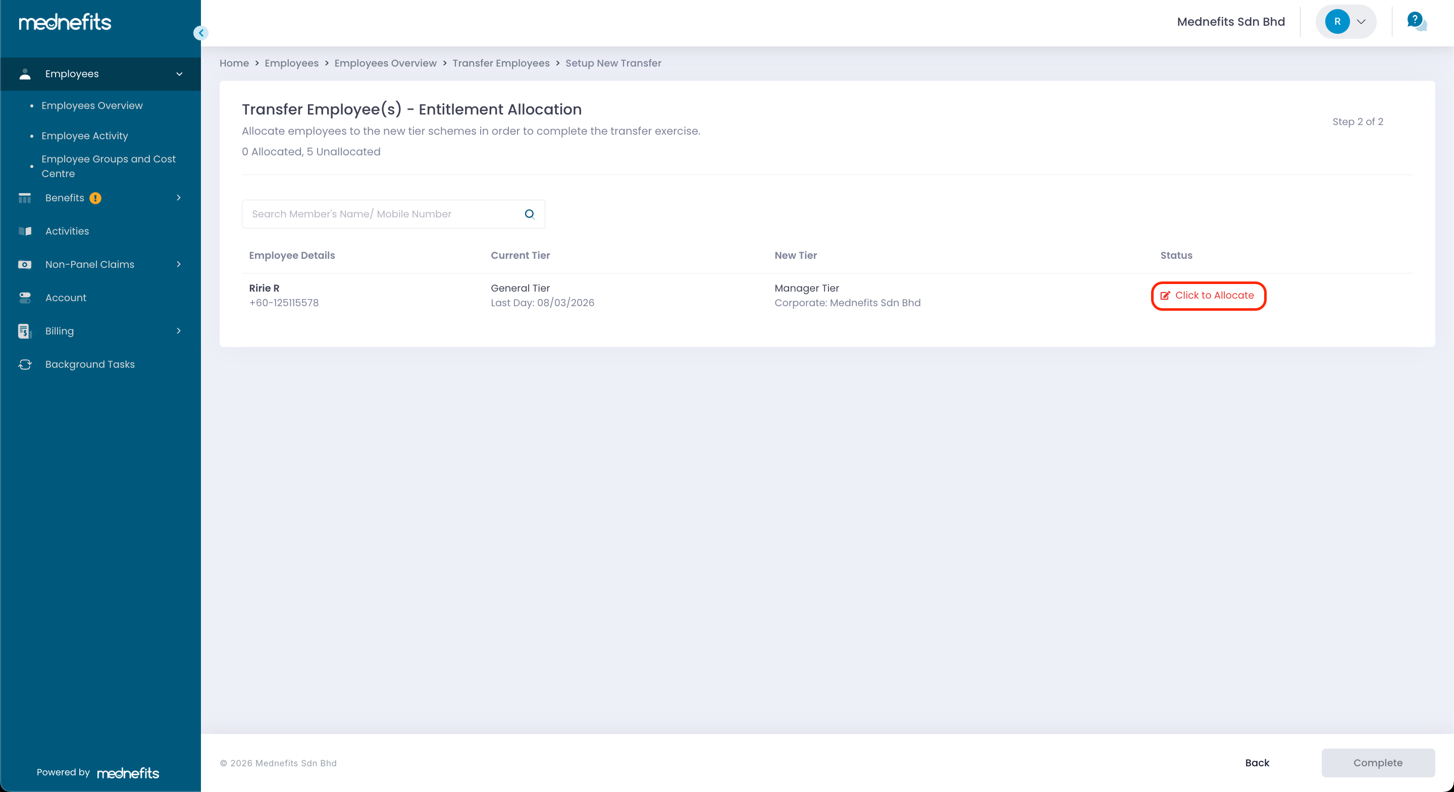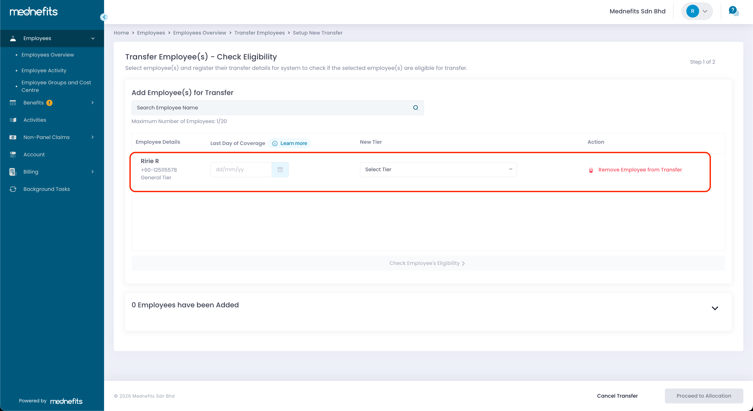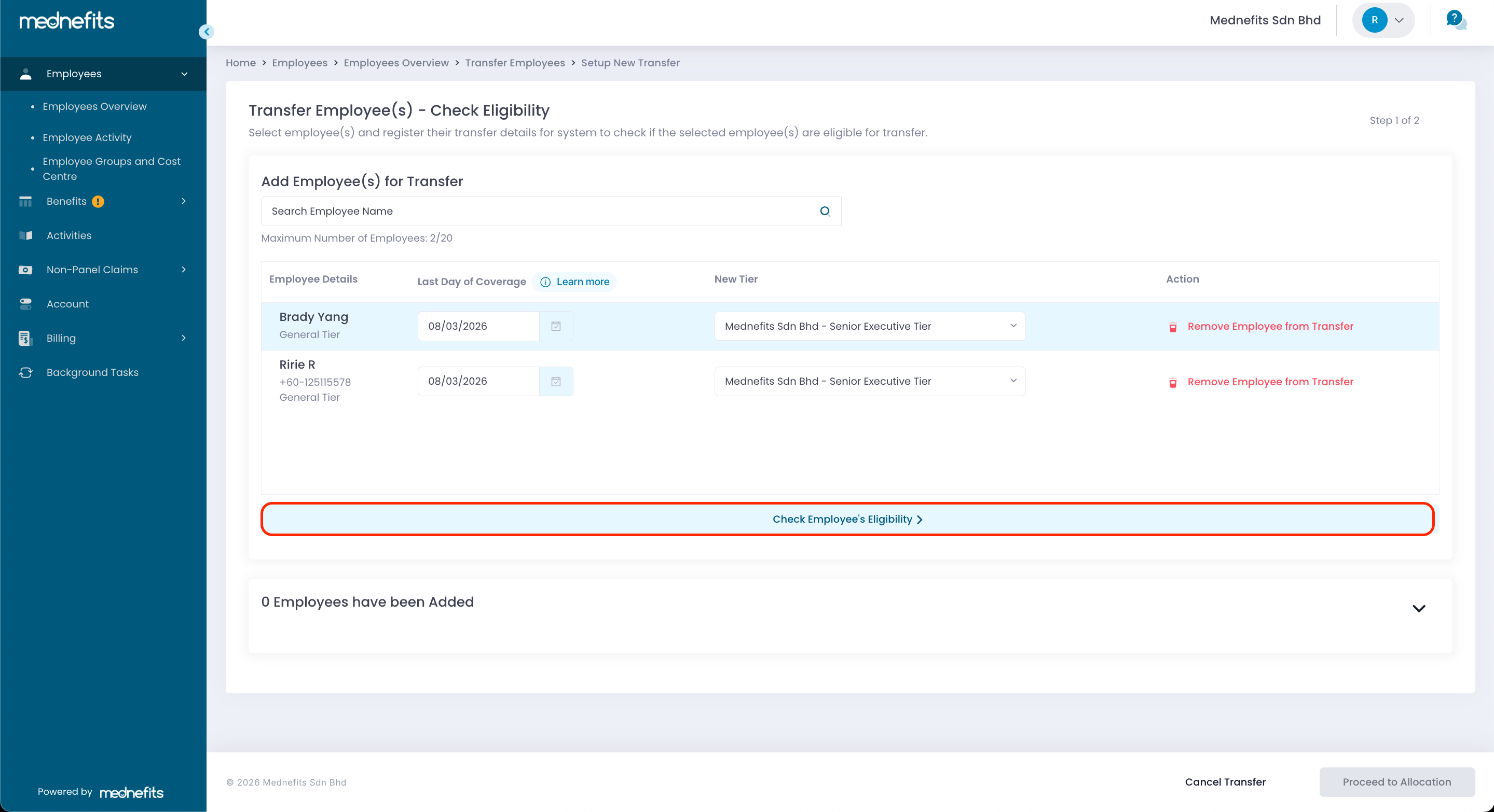Step 5: This page displays the number of employees who are eligible for transfer. Click Proceed to Allocation to continue with the next steps. (For a smooth transfer process, kindly ensure that all claims have been processed).