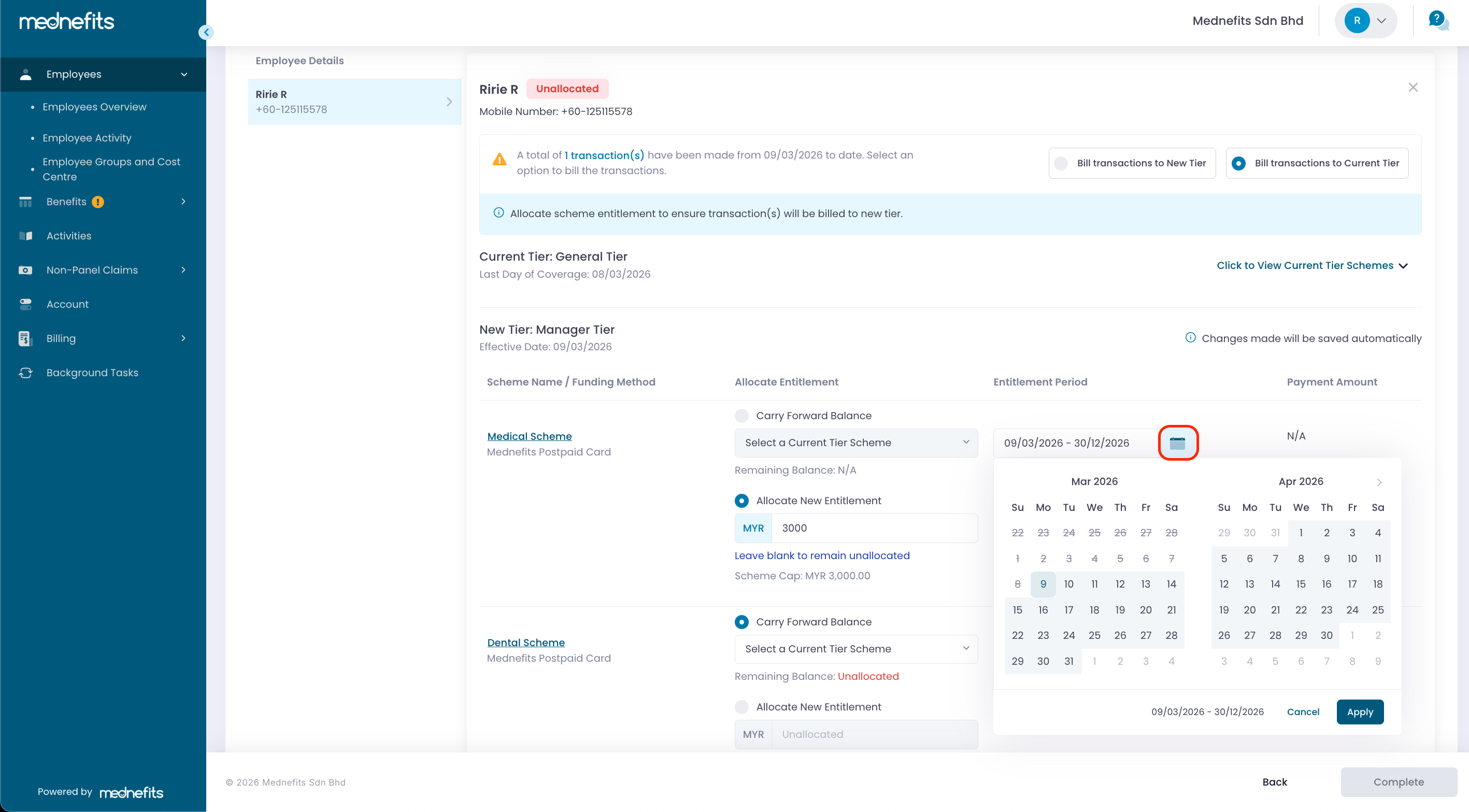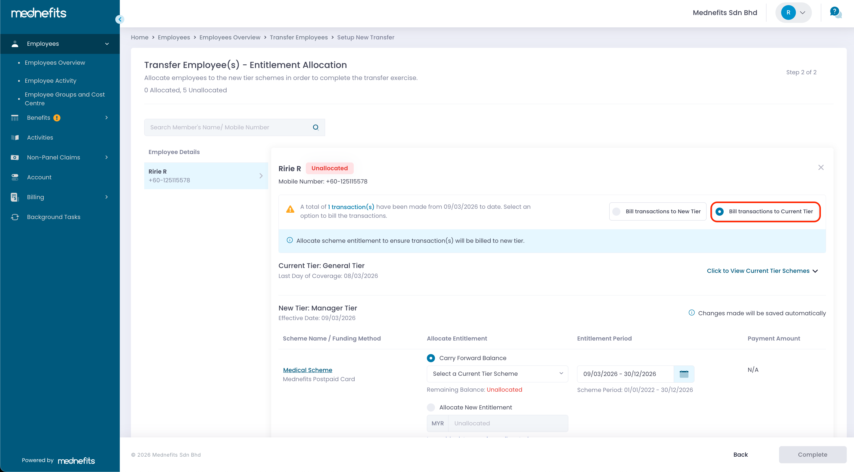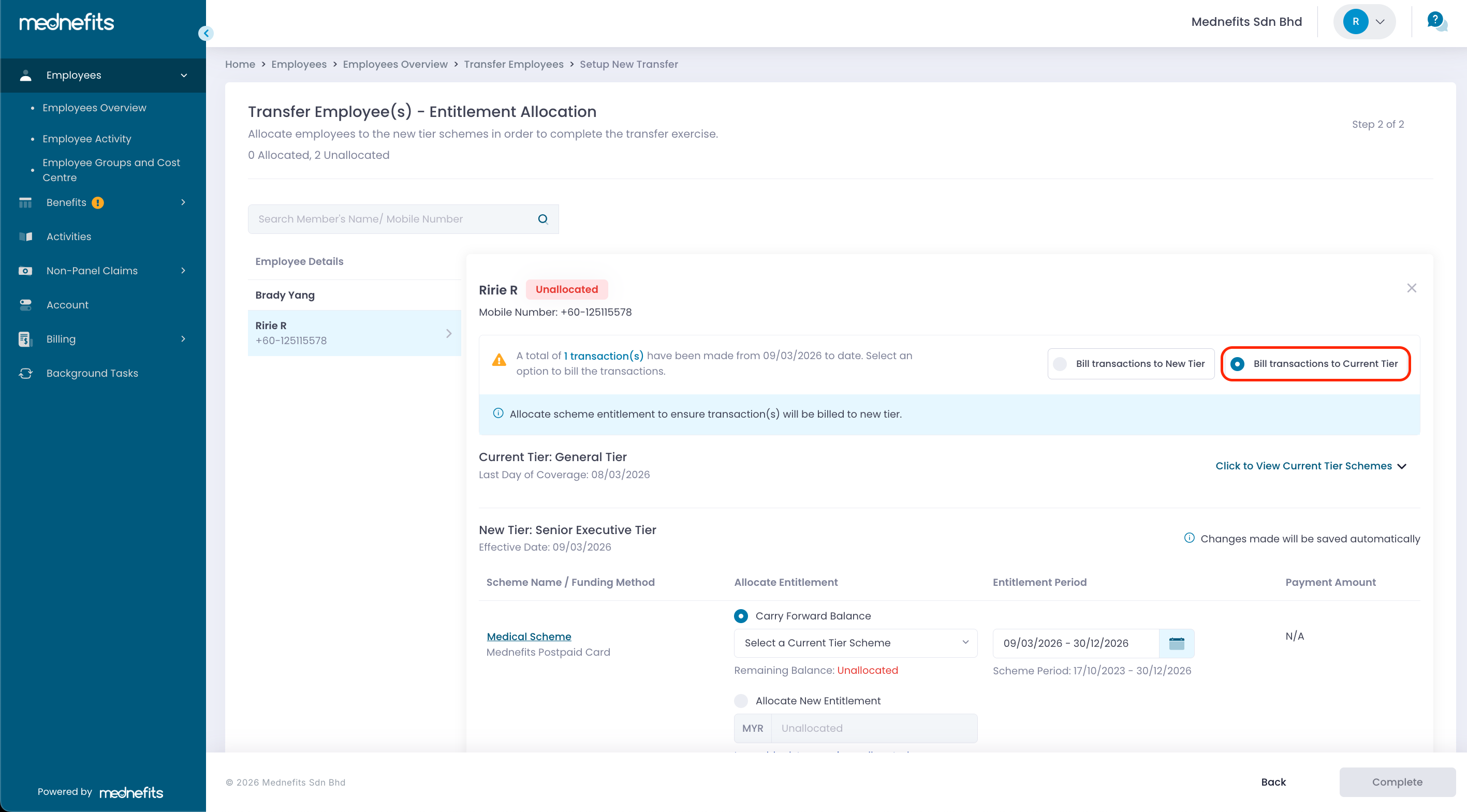 By selecting Bill transactions to Current Tier, the Via Mednefits amount from these transactions will be invoiced to employee’s old tier scheme, and deduct from the old tier scheme balance. Besides that, these transactions will be invoiced under the old tier.