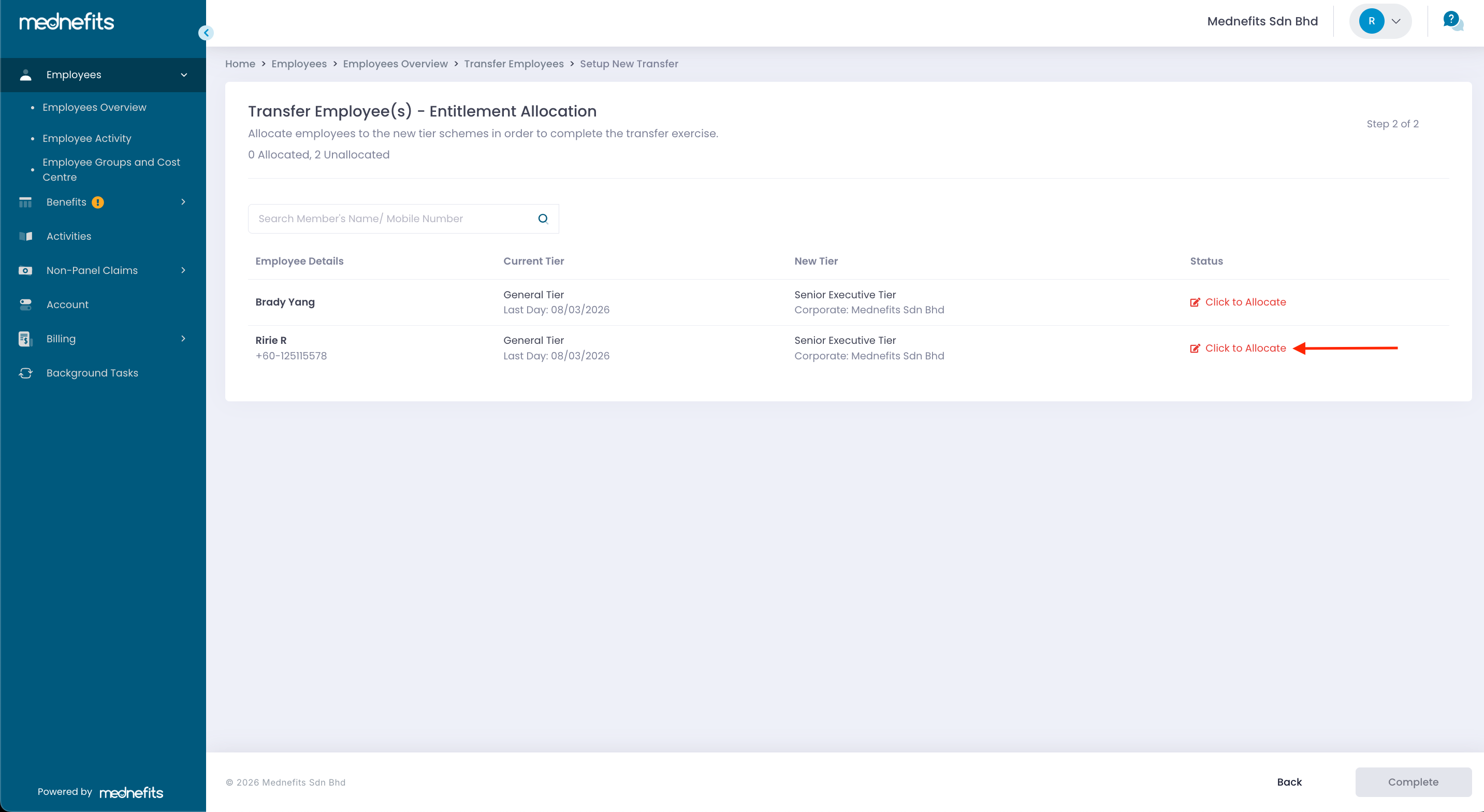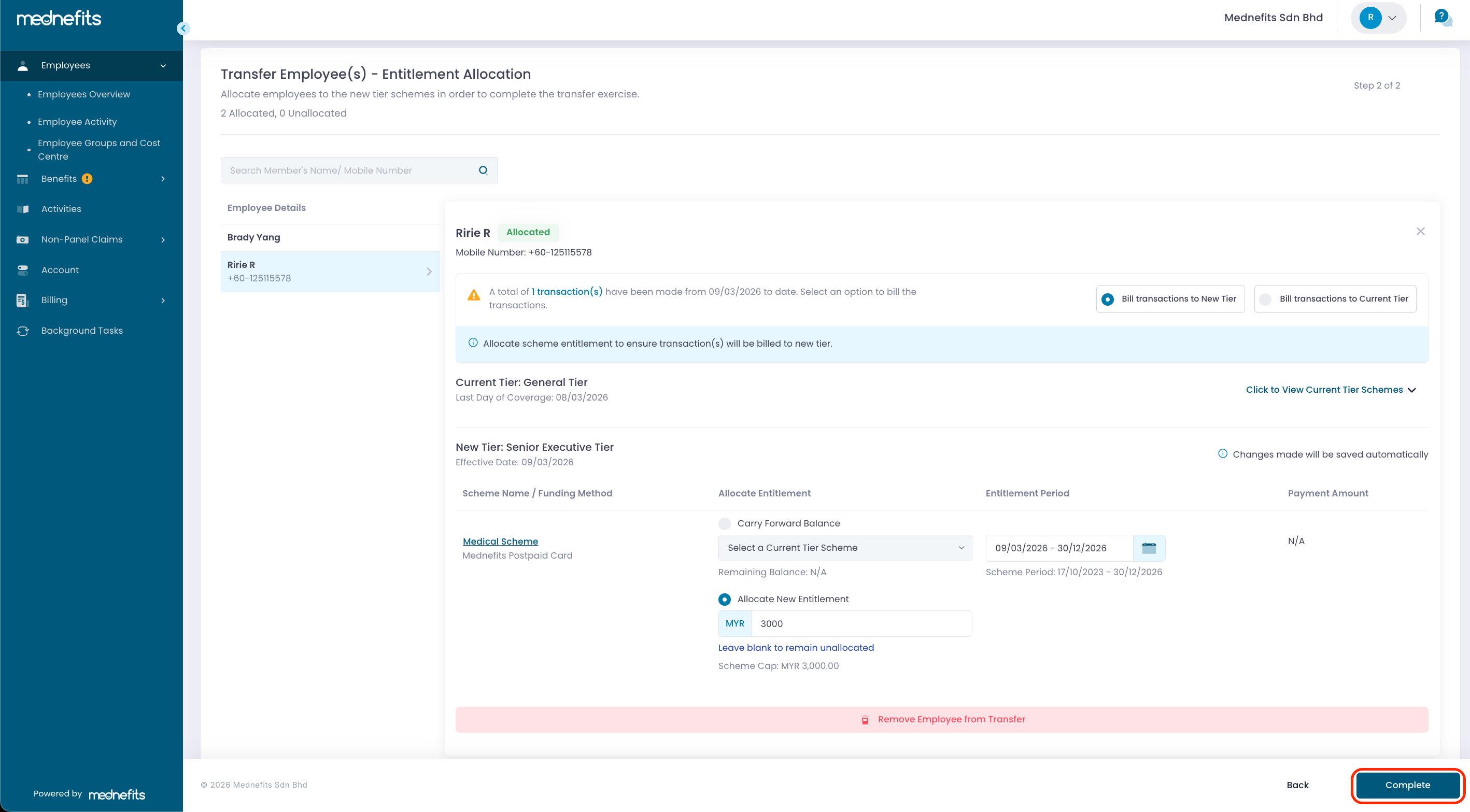 Step 9: Continue to allocate the entitlement to all listed employees, then click Complete to finalize the transfer exercise. (The Complete button will be greyed out if allocation hasn't been made for all listed employees)