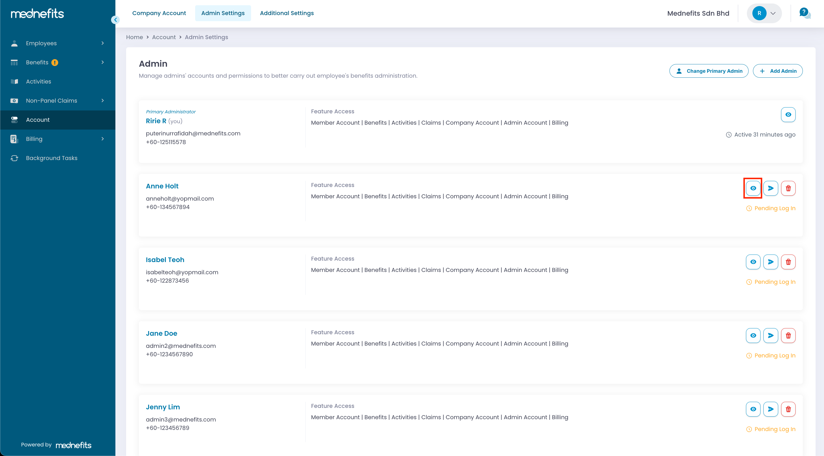Step 2: Select the administrator whose permission you wish to edit and select the icon to view the existing permission that the administrator has.