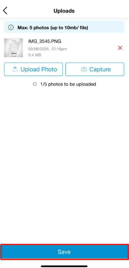 Step 3: You may choose to Upload Photo if you already have photos of the receipt on your phone or choose Capture to take photos of all the receipts you need to upload and click on Save. You can upload maximum of 5 photos. (Please be noted this action can't be undone hence kindly ensure that the right receipts are uploaded)