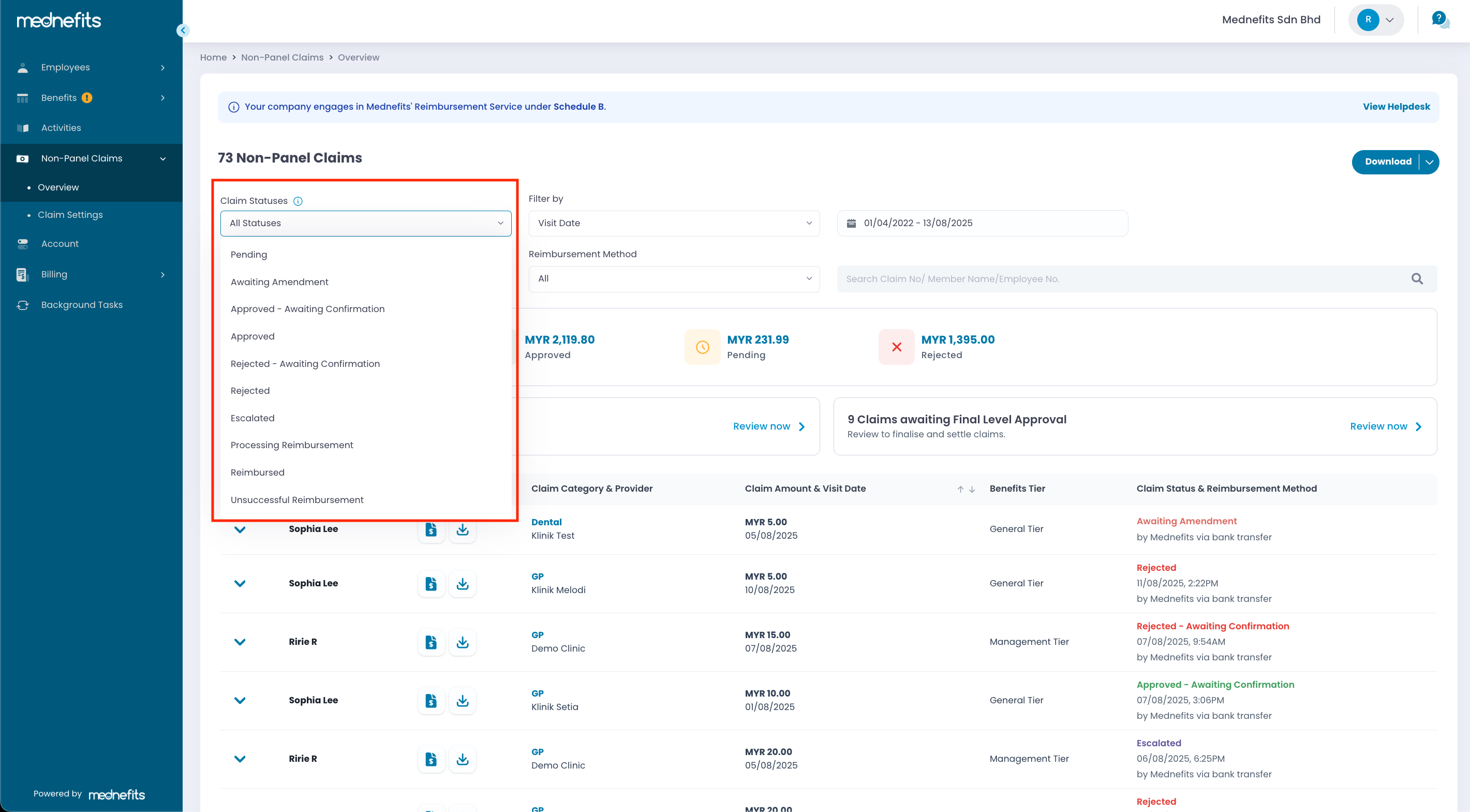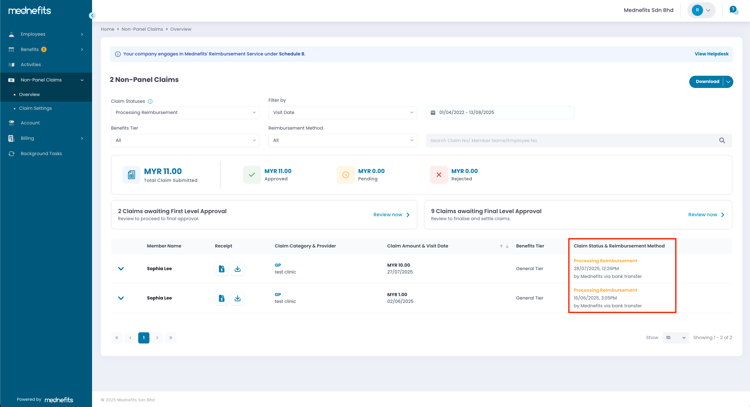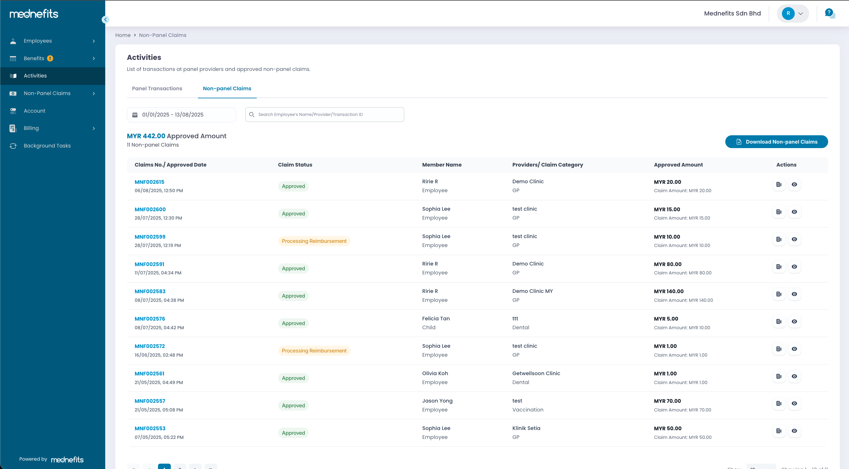 To fully utilize this feature, especially for reimbursements processed by Mednefits, review your company’s reimbursement schedule and use this page to effectively track the progress of your employees' non-panel claims. For guidance on identifying your company’s reimbursement schedule, please refer to this helpdesk article.