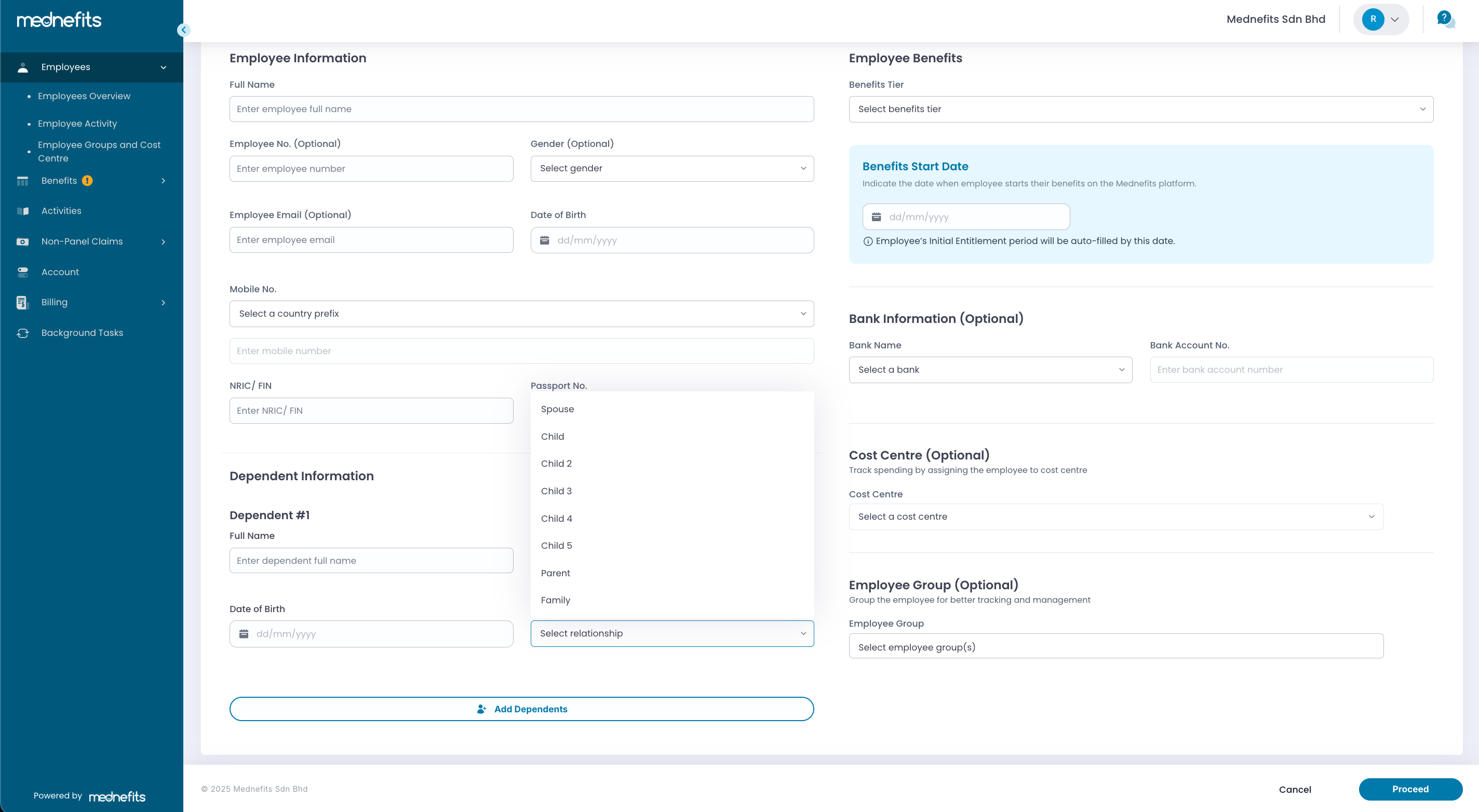 For companies where the employee and dependents share the same entitlement, no changes are required. You may continue to enrol dependents using a general relationship type such as Child. The system will then apply the same entitlement scheme to all dependents accordingly.