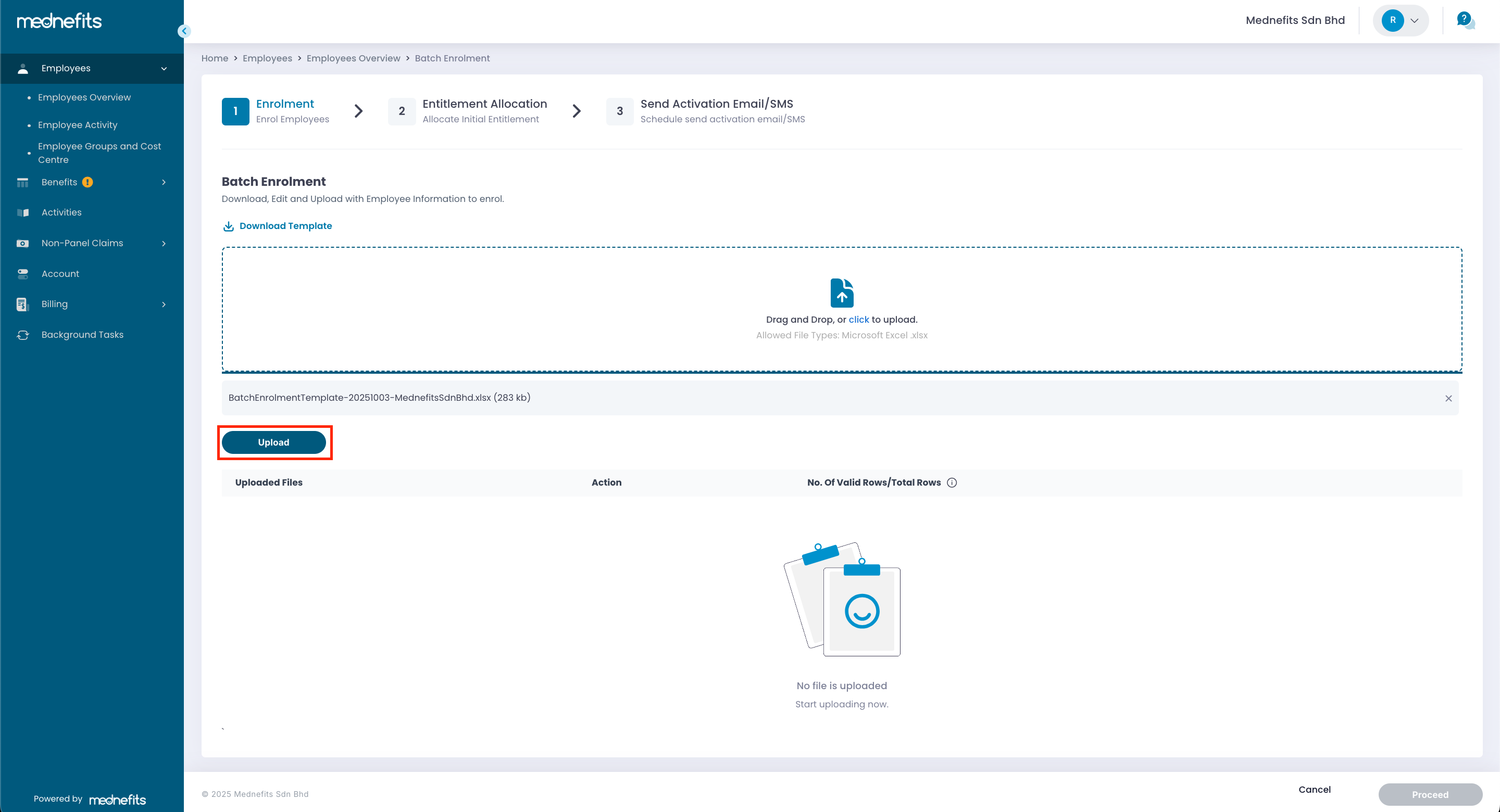 Step 3: After completing the enrolment in excel, Drag and Drop or Click to upload the excel. Select Upload to proceed.
