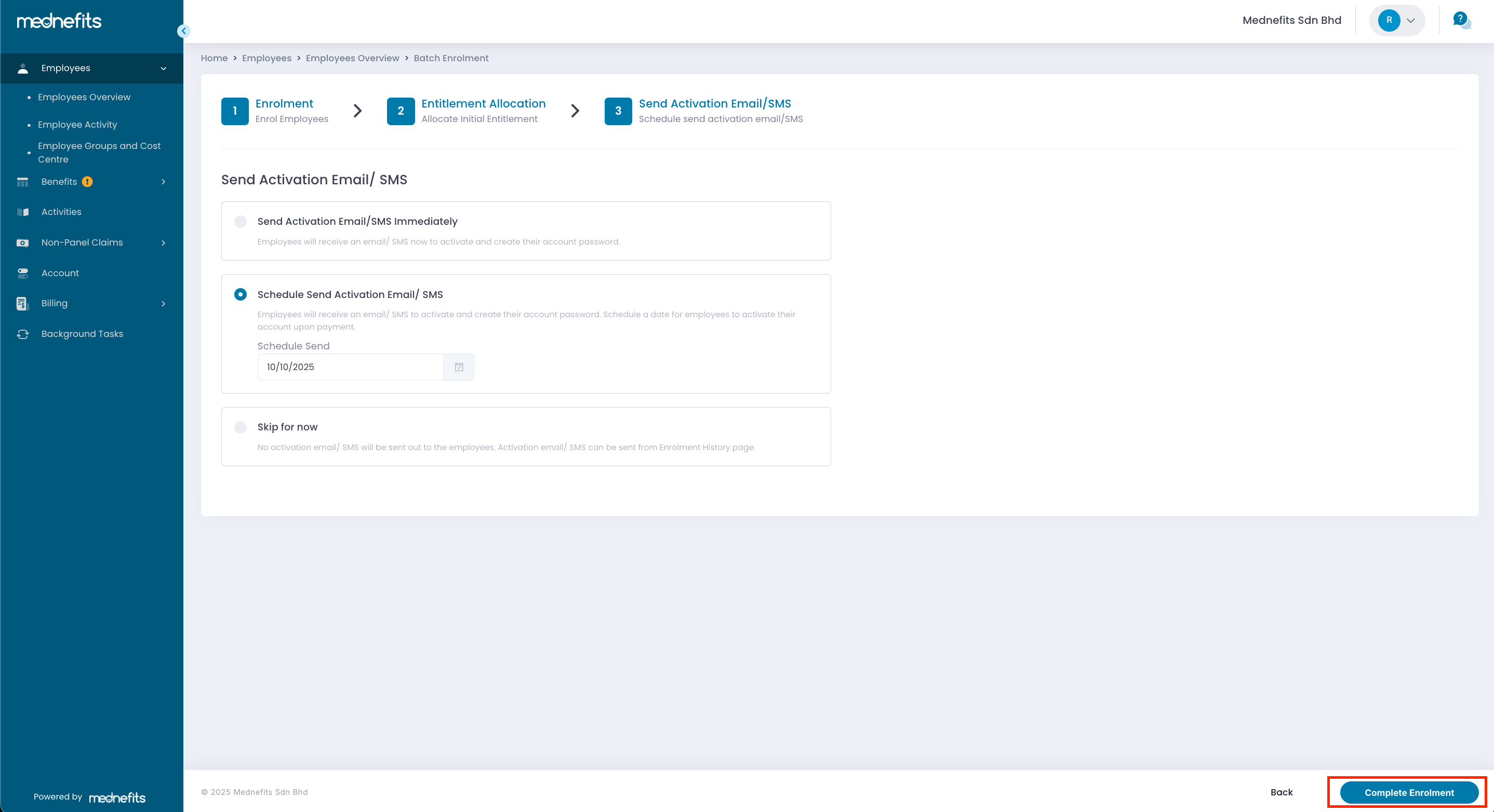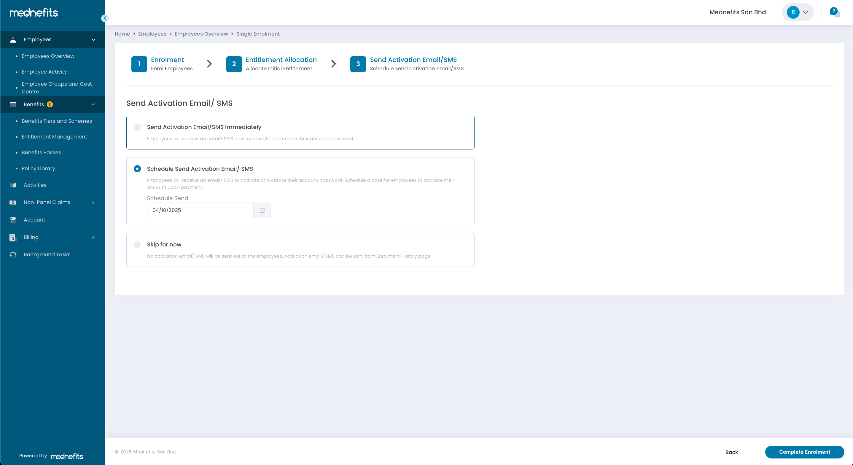 Step 6: Send Activation Email/SMS, then select Complete Enrolment to complete the enrolment process.