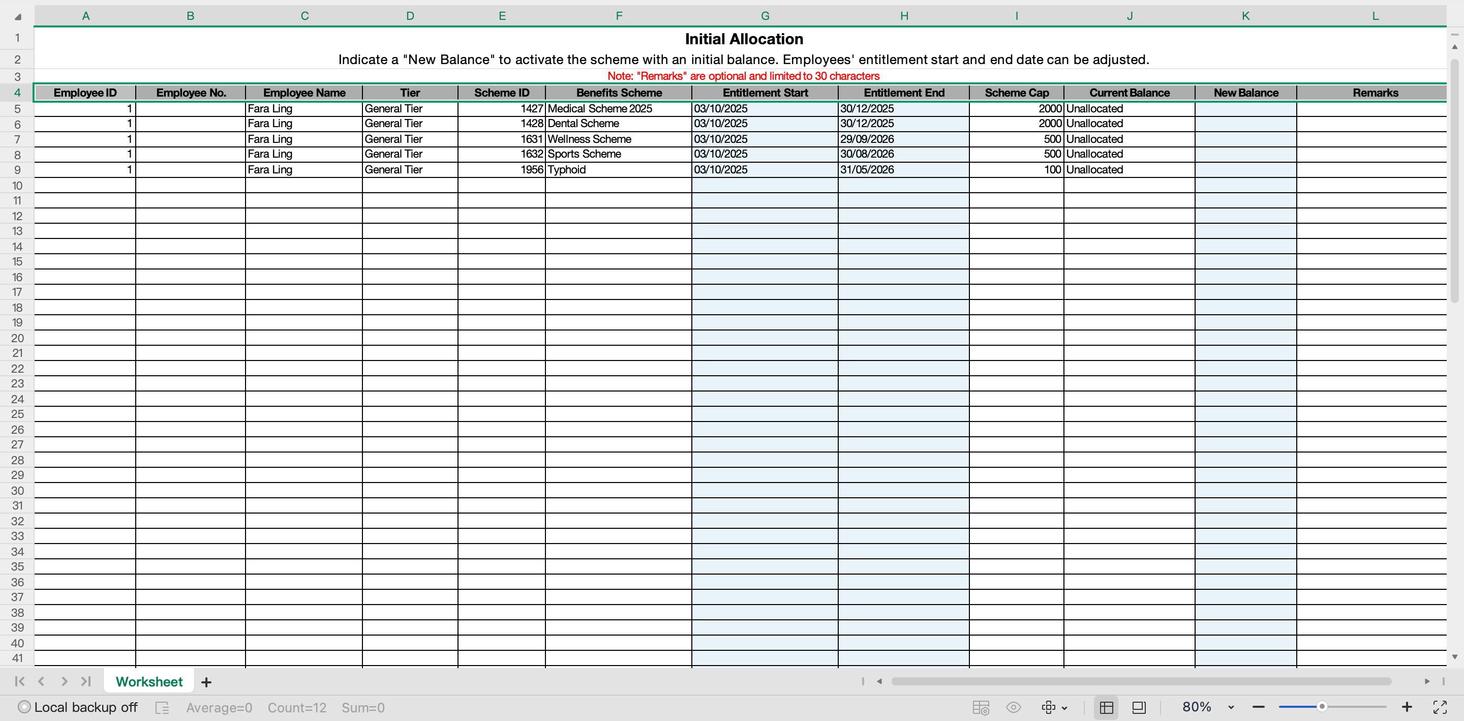 - Indicate a <new balance> and <remark> to perform the allocation of these employee-scheme(s).