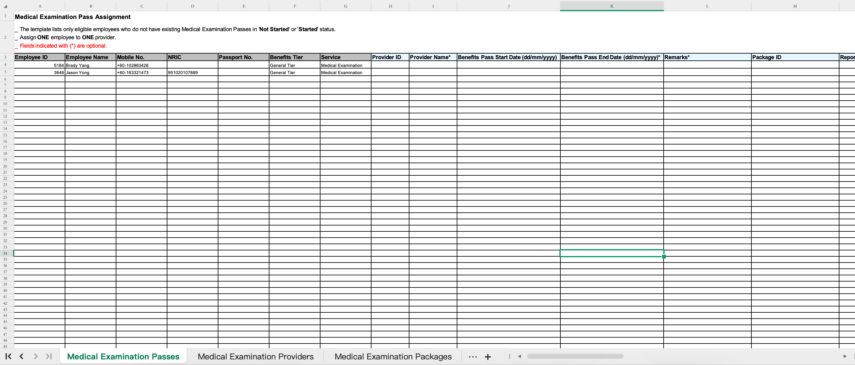 Notes: Navigate to the Medical Examination Benefit Passes sheet to specify the provider(s) and other configurations. HR/admin is required to complete the following fields: