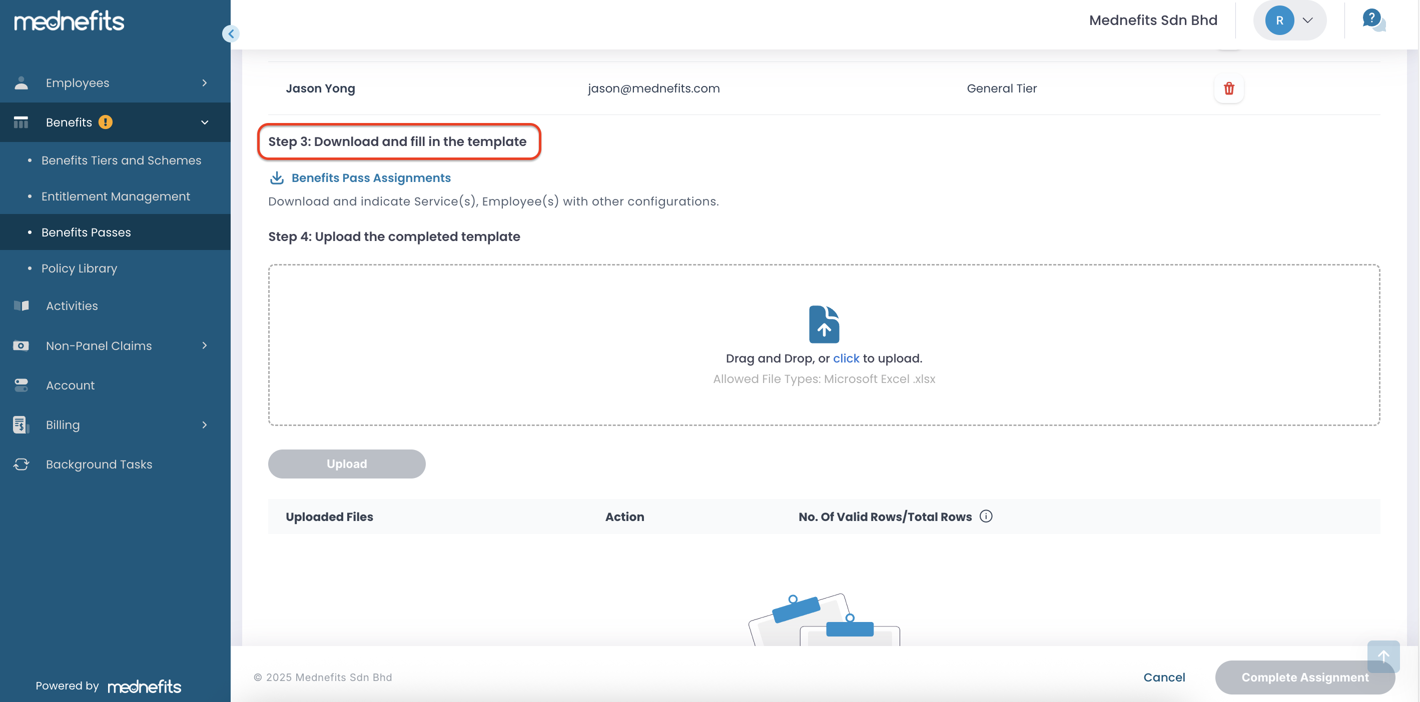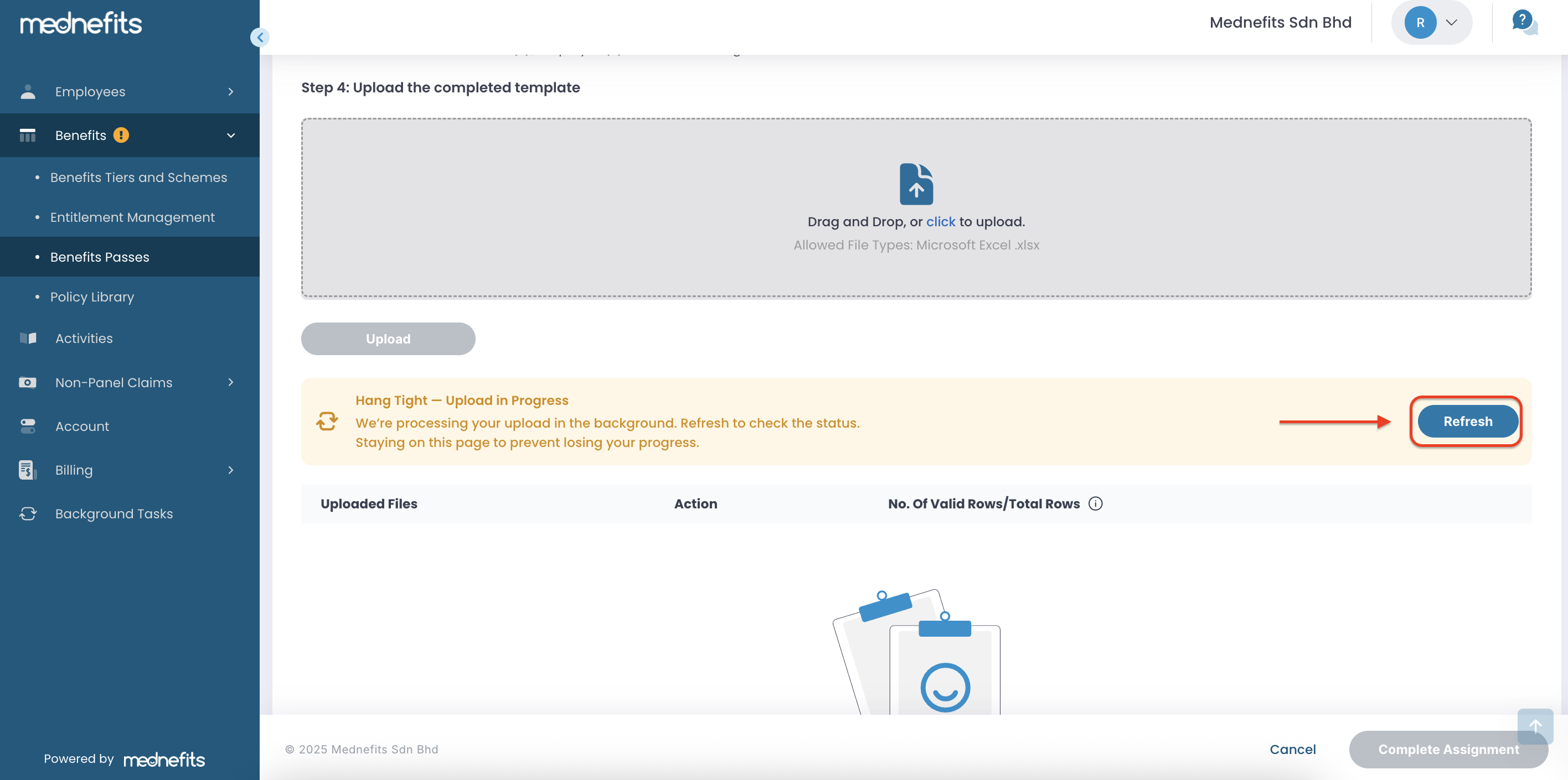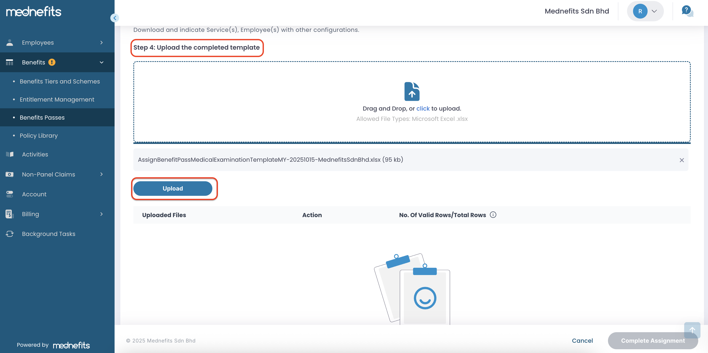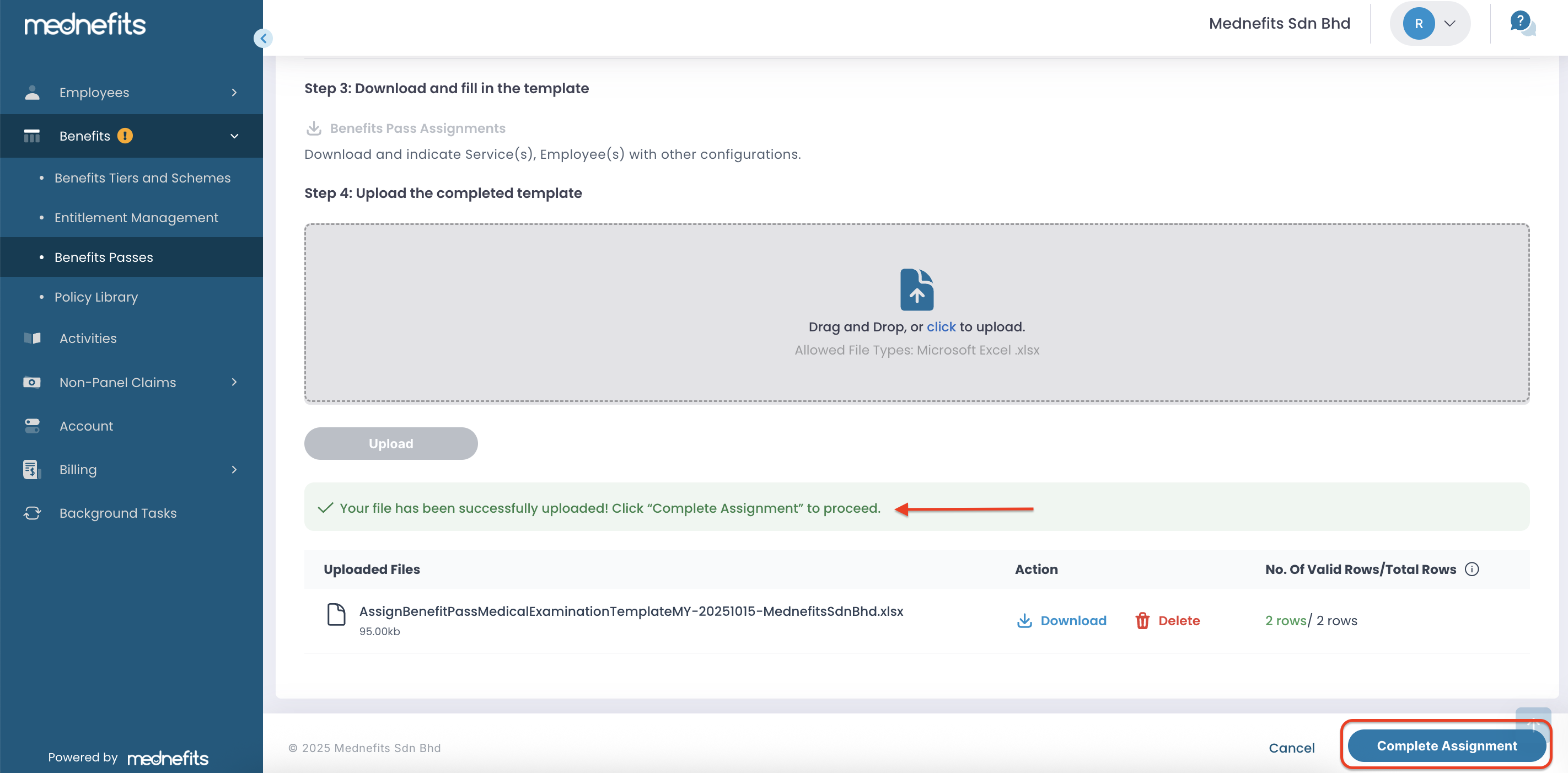 Once the template is completed, proceed with the upload. If the file contains no errors, proceed with completing the assignment.