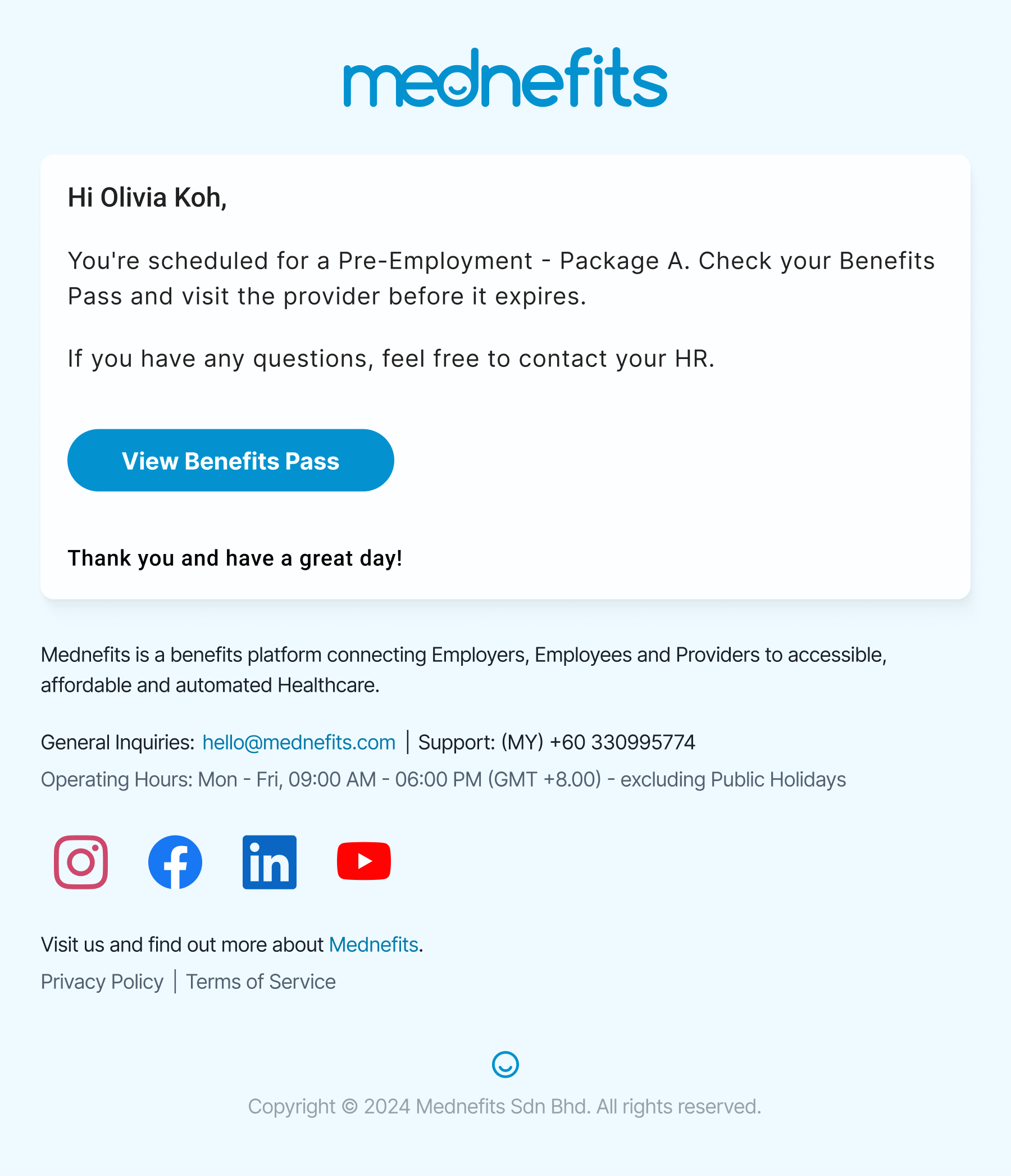 Once a Benefits Pass for Pre-Employment Check-Up is successfully assigned by your HR/admin, the employee will be notified via: