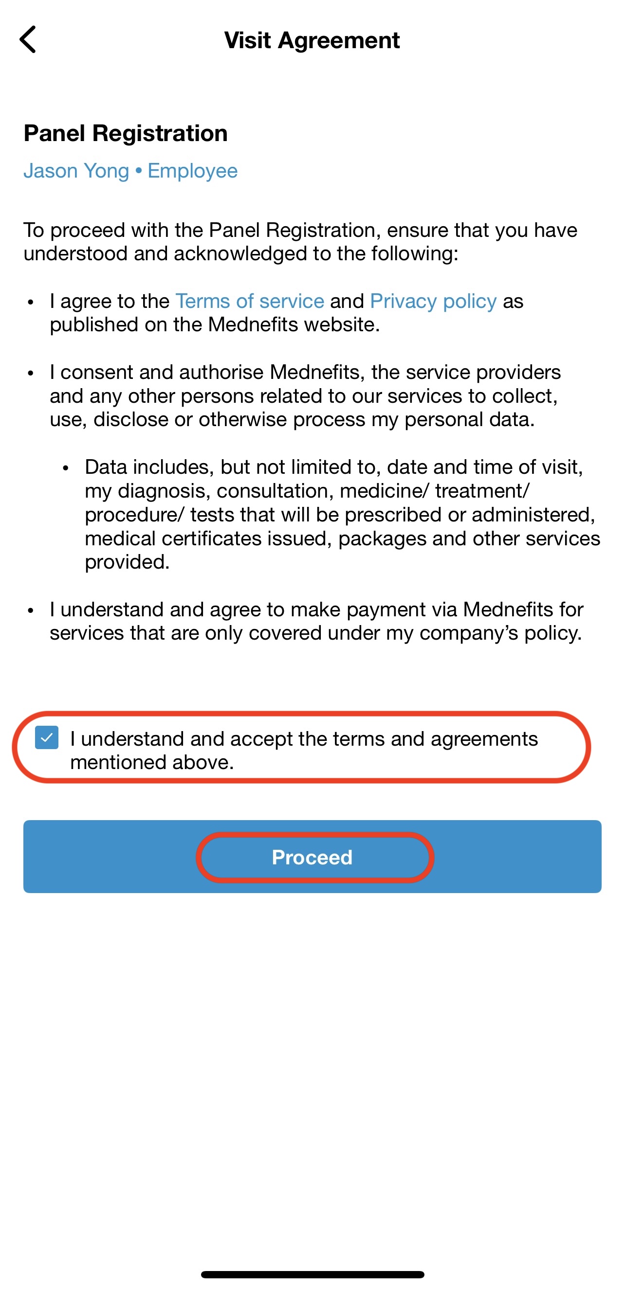 Step 3: Review and accept the terms, then tap “Register Visit”