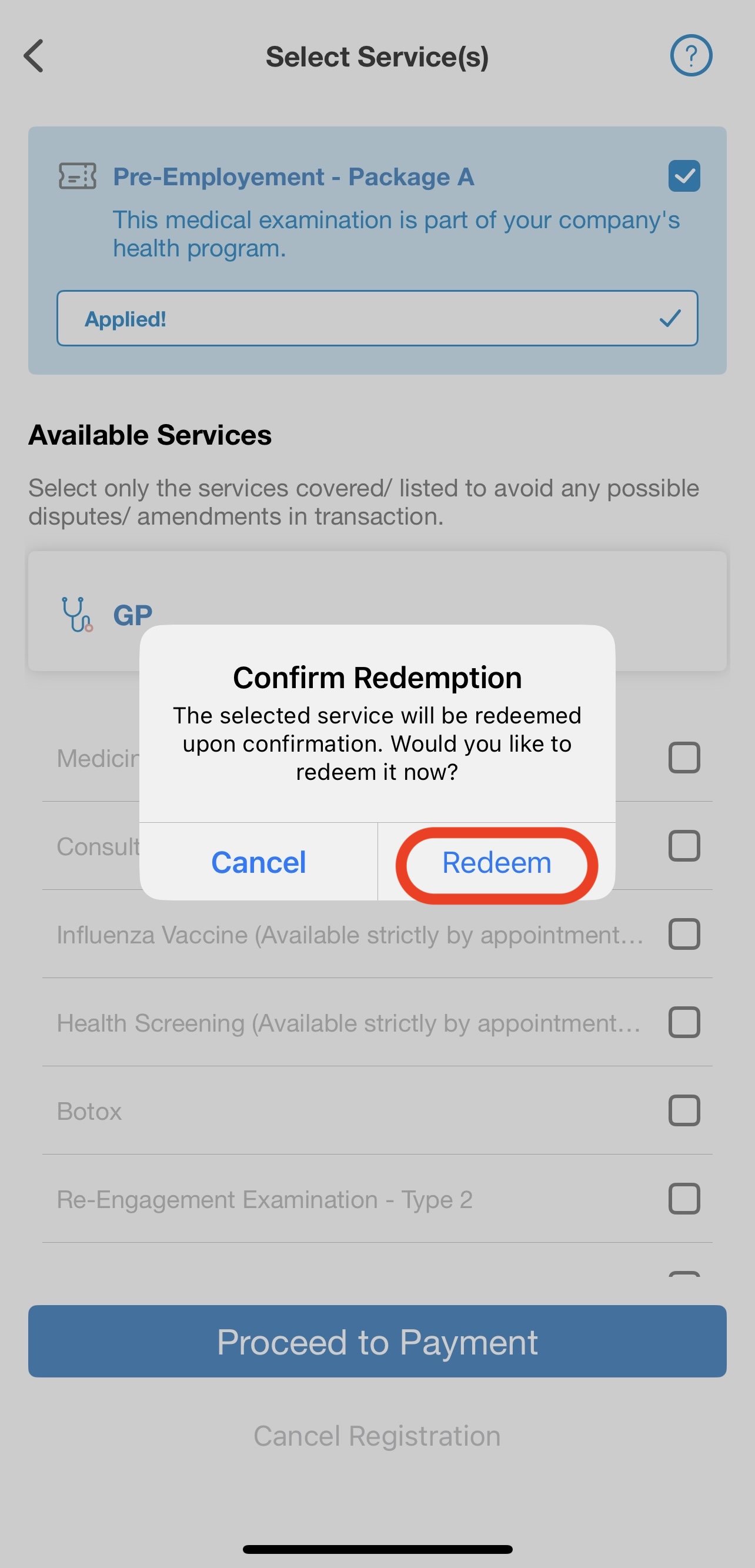 Step 5: Tap “Proceed to Payment” > “Redeem”. The assigned package will be auto-selected.
