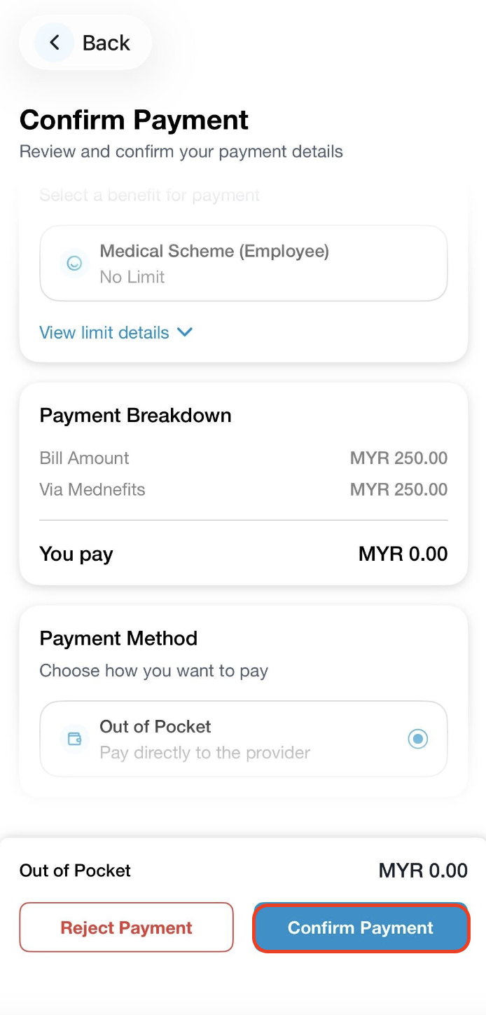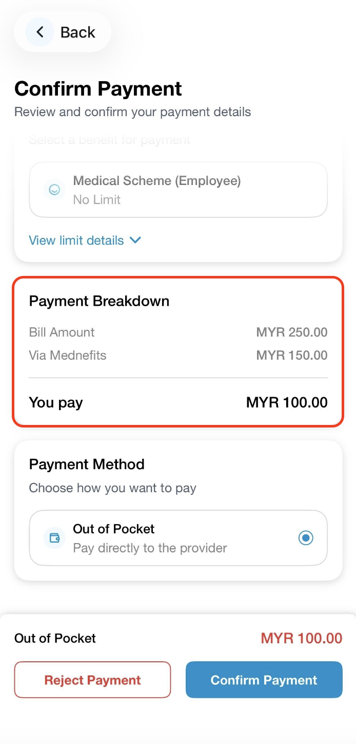 Note: Out of Pocket will be shown in red if required and you need to make payment directly to the provider.